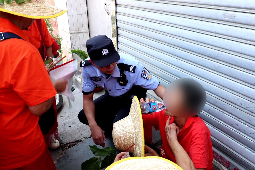 当时,只见巡游队伍中一老人家四肢无力倒地不起,疑似出现中暑症状。见状,民警急忙搀扶住老人家,将老人家从路中央位置扶到路边阴凉处休息,并告知周边同事注意及时疏散围观群众,保证通风。