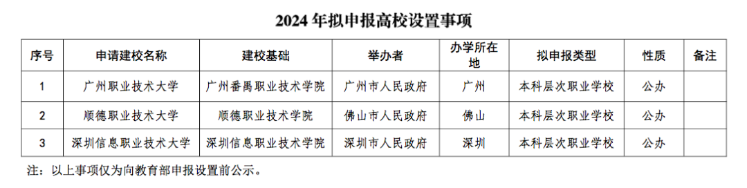 《公示》称,根据《中华人民共和国高等教育法》《普通高等学校设置暂行条例》《本科层次职业学校设置标准(试行)》《教育部关于“十四五”时期高等学校设置工作的意见》等有关规定,为做好2024年拟申报高校设置事项相关工作,经广东省高等学校设置评议委员会专家考察和评议,现对拟向教育部申报的以广州番禺职业技术学院为基础设立广州职业技术大学、以顺德职业技术学院为基础设立顺德职业技术大学和以深圳信息职业技术学院为基础设立深圳信息职业技术大学等事项予以公示。