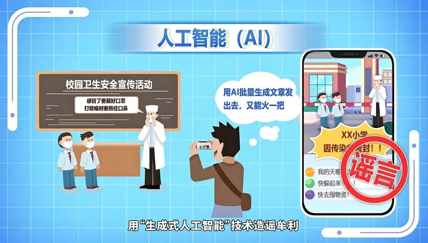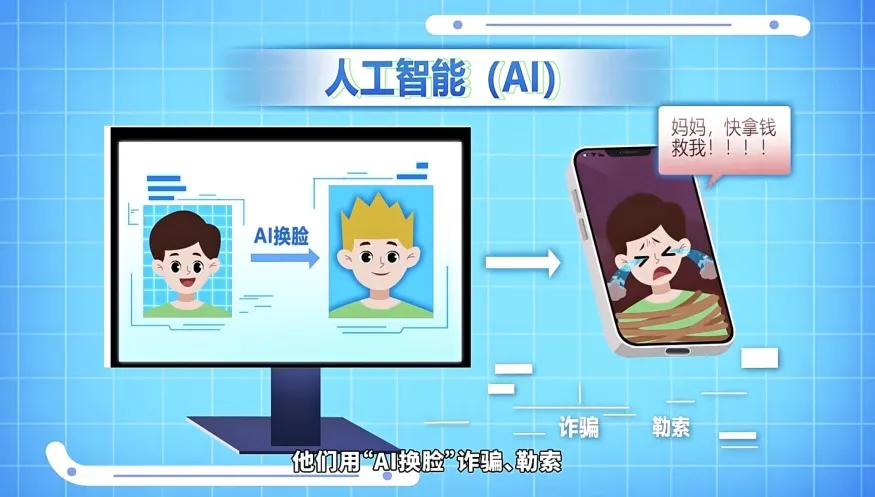 除了彬彬遇到的被坏人用密聊软件诱导实施犯罪的情况,现在流行的人工智能(AI)可能被坏人利用,他们用“AI换脸”诈骗、勒索,用“AI绘图”“AI一键脱衣”等制作发布淫秽色情图片和视频,用“生成式人工智能”技术造谣牟利,甚至引发大家恐慌。