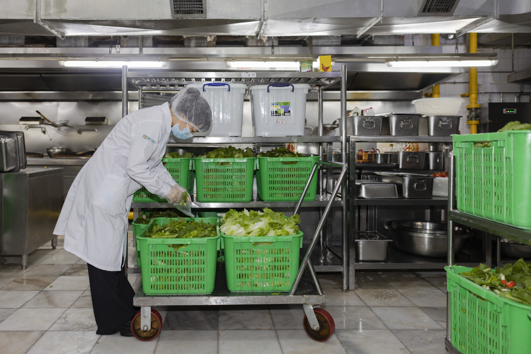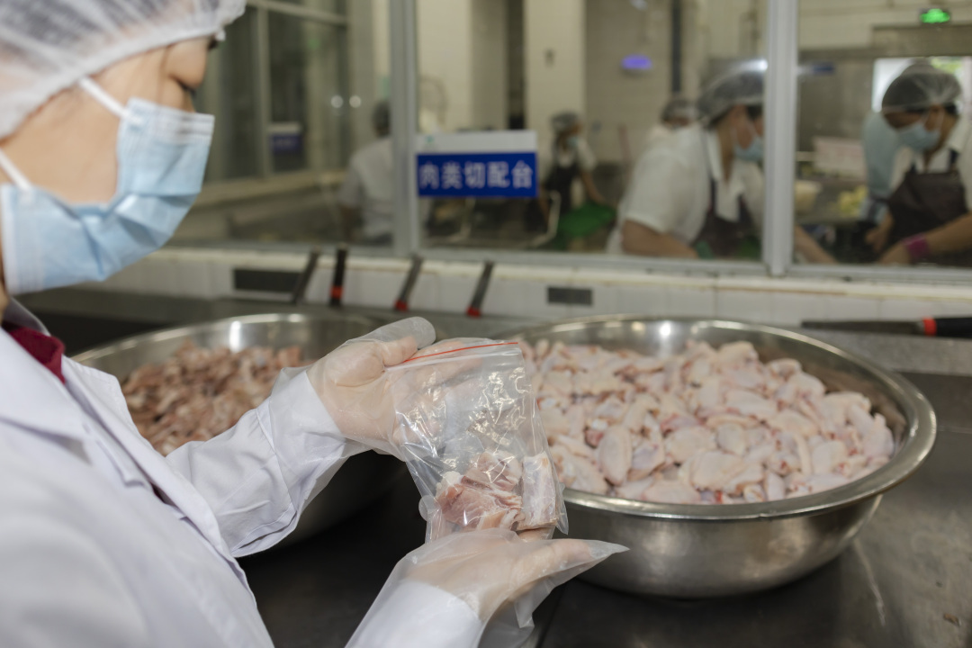 “就算有时蔬菜加工区比较繁忙,肉类加工区处于空闲状态,我们也不允许将蔬菜拿到肉类加工区去加工。食材按照类型分区域加工是一项基本要求。”广州市第六中学总务处主任助理林继青介绍道。