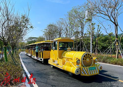 市民游客在滨海公园内乘坐“小火车”观光。