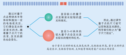 通过对量子点这种纳米半导体材料施加一定的电场或光压,它们便会发出特定波长的光,随着量子点尺寸的改变,发光的颜色也会变化。
