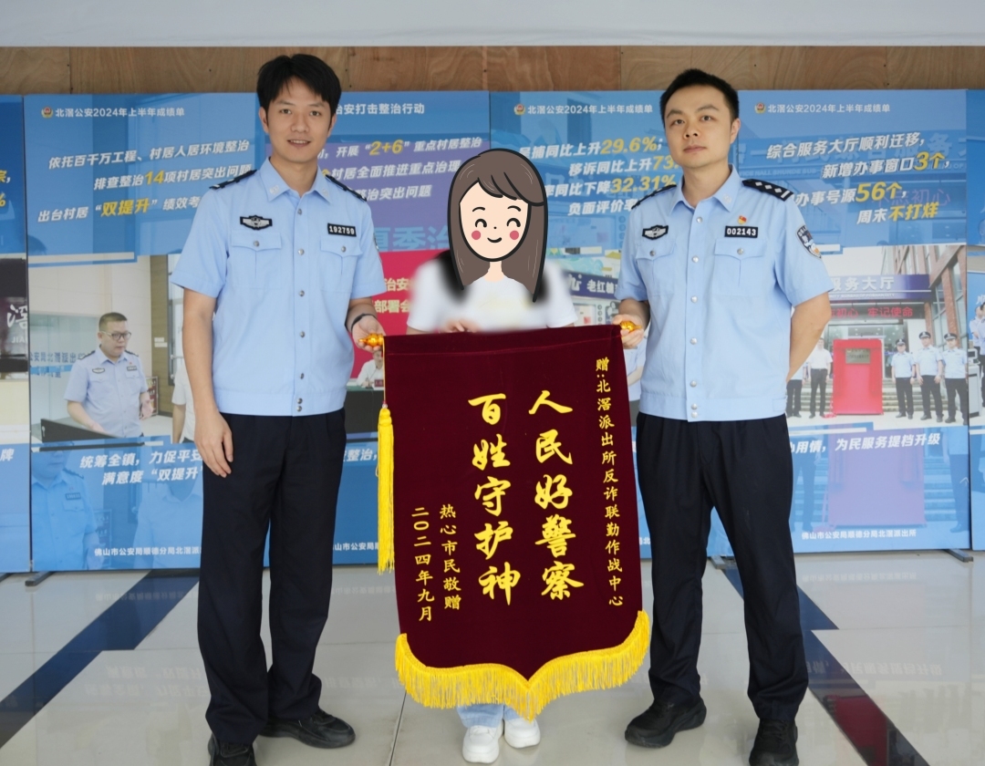 9月24日,为感谢北滘派出所反诈专班及时劝阻,陈女士特意送来一面印有“人民好警察 百姓守护神”的锦旗致谢。