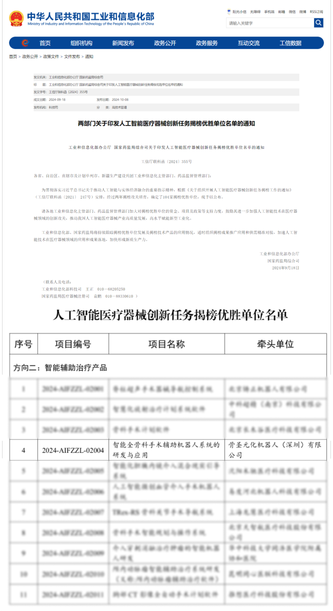 10月8日,工业和信息化部与国家药品监督管理局联合公布“人工智能医疗器械创新任务揭榜挂帅优胜单位”名单,元化智能全资子公司骨圣元化机器人(深圳)有限公司(以下简称“骨圣元化”)入选。