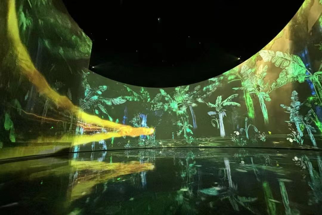 高大开阔的展厅内,多位家长带着小朋友席地而坐,安静地看壮观的青绿山水从巨大的弧形屏幕上出现,又化为深邃的森林、月照的沙漠,浩瀚的星空。