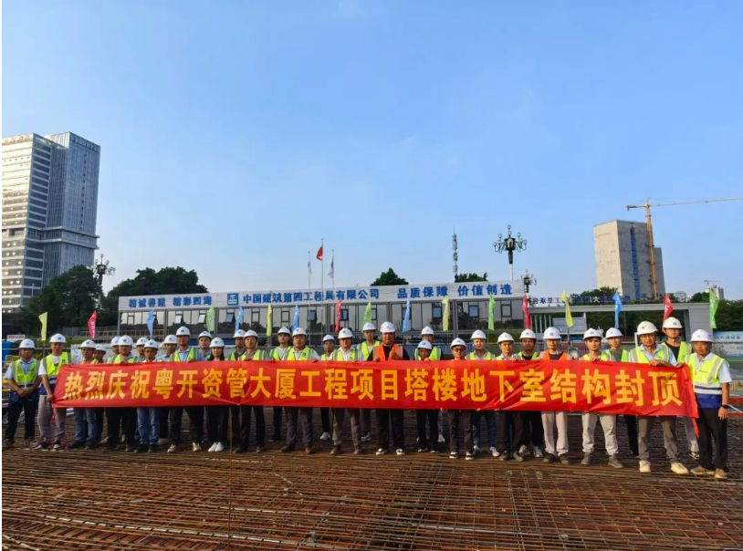(粤开资管大厦工程项目塔楼地下室结构顺利封顶。)