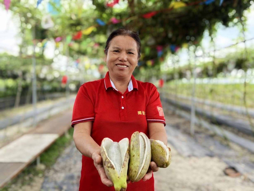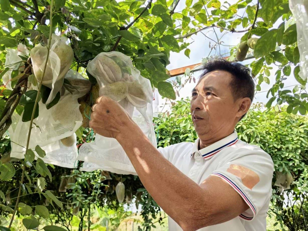 走进果园,记者看到翠绿的棚架上挂满了一串串“八月炸”,这些果实都被套上了一个个白色网袋,以防虫鸟的侵害,成熟的果实都已经咧嘴“笑开了花”,露出了洁白的果肉,散发出淡淡的清香,让人垂涎欲滴。园主钟祥华和妻子正在采摘成熟的“八月炸”。他告诉记者,虽然今年的产量略有减产,但果品质量却不错,国庆期间,前来争相尝鲜的客人不少。