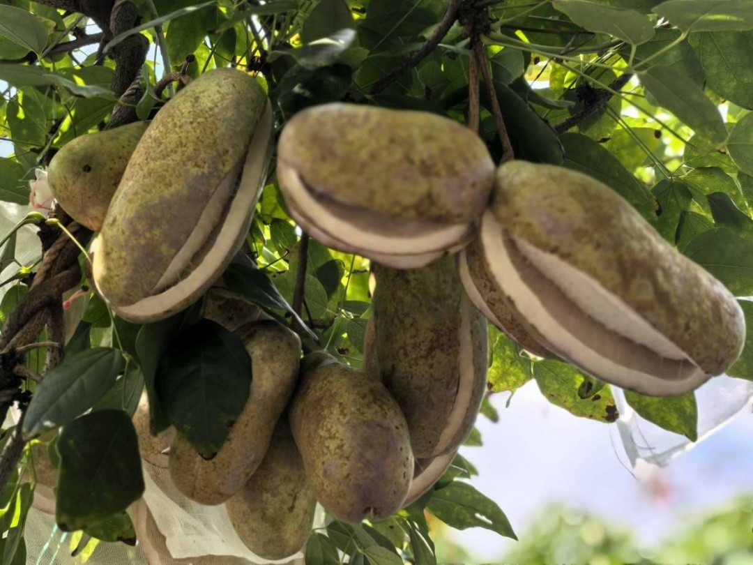 据了解,“八月炸”是藤本植物三叶木通的果实,中药名叫预知子,是药食两用的野果,果实呈不规则的长圆形或椭圆形,因在农历八月成熟开裂而得名。钟祥华在自己的果园已经成功种植了五年“八月炸”,今年还新种了320多棵都已成活。