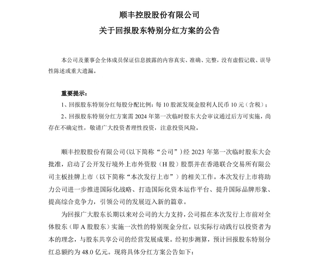 从特别分红方案的目的上来看,顺丰控股表示,为回报广大股东长期以来对公司的大力支持,公司拟在本次发行上市前对全体股东(即A股股东)实施一次性的特别现金分红,以实际行动践行以投资者为本的理念,与股东共享公司的经营发展成果。据悉,顺丰控股经2023年第一次临时股东大会批准,启动了赴港上市的相关工作。本次发行上市将助力公司进一步推进国际化战略、打造国际化资本运作平台、提升国际品牌形象、提高综合竞争力,引领顺丰控股的发展迈入新的篇章。