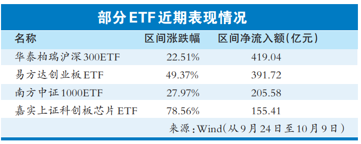 在当前股市一片火热之际,资金借道ETF疯狂抢筹。Wind数据显示,9月24日至10月9日,已有近3000亿元的资金净流入ETF基金,ETF基金规模已达到3.5万亿元;从收益来看,同期有73只ETF基金区间涨幅超50%。值得关注的是,10月15日,首批中证A500ETF基金将上市,百亿增量资金正陆续入市。拉长时间来看,自9月24日以来,已有超千亿元的资金净流入宽基ETF,其中华泰柏瑞沪深300ETF、南方中证1000ETF等净流入金额均在百亿元以上。从投资者关心的收益来看,Choice数据显示,自9月24日以来,165只ETF收益超50%,其中金融科技ETF、创业板50ETF、科创芯片ETF等涨幅居前。