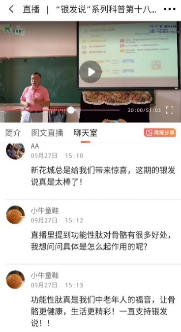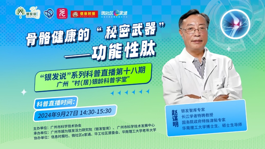 为进一步普及关节健康知识,加深市民群众对骨关节疾病防治的认识,近日,广州市科学技术协会携手广州市越为银发活力研究院(银发智库)、广州市科学技术发展中心、信息时报社、微社区e家通、华工社区居委会、华南理工大学老年大学,举办“骨骼健康的‘秘密武器’——功能性肽”广州村(居)银龄科普学堂第18期“银发说”系列科普直播活动。