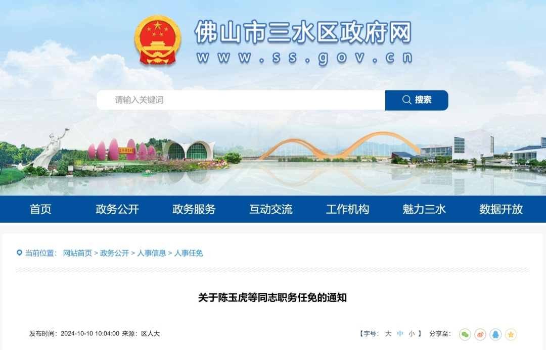 陈玉虎同志为佛山市三水区人民政府办公室主任;