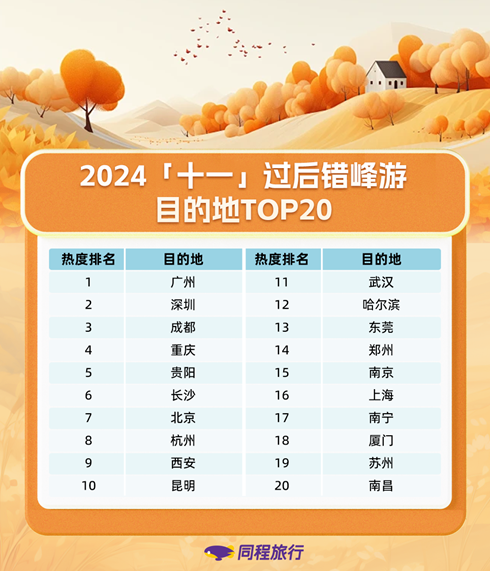 同程旅行平台数据显示,“十一”后的错峰游需求相对集中于长假期间的“顶流”目的地,例如:广州、深圳、成都、重庆、贵阳、长沙、北京、杭州、西安、昆明等。据介绍,节后第一周错峰游人群主要是年轻白领和中老年客群。部分年轻白领选择假期值班节后错峰出游,他们相对比较青睐大型主题公园,中老年客群则相对偏好山岳类风景区及秋游主题的跟团游产品。