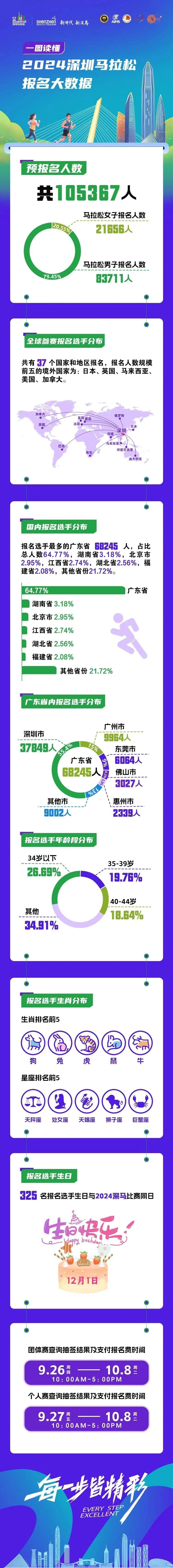 “今年我们还统计了报名选手一些有趣的数据,这对于深马趣味性有一定提升。比如,你知道本届深马哪几个生肖的朋友排名靠前吗?”深马组委会有关负责人这样说道。据悉,本届深马报名选手生肖分布前五名分别是:狗、免、虎、鼠、牛。此外,星座排名前五名是:天秤座、处女座、天蝎座、狮子座、巨蟹座。“我们还发现,有725名报名选手生日与本届深马同日。届时,我们期待为成功参赛的‘寿星公’们在深马舞台上庆贺生日。”