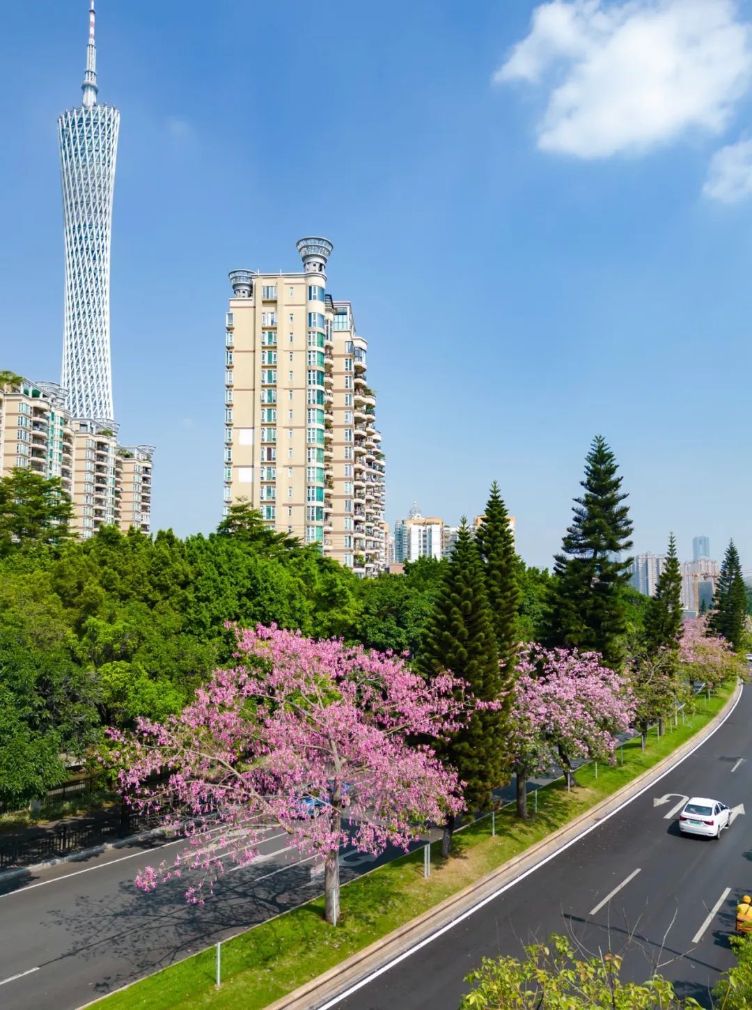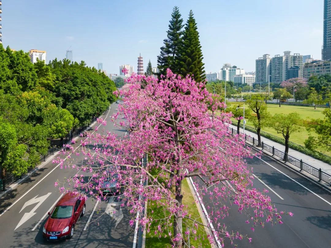 秋高气爽,近期广州的天气晴空万里,进入了一年当中最舒服的时节。伴随着连日来的好天气,全市多地的美丽异木棉纷纷进入了花期,粉色花朵挂满枝头,扮靓了广州的大街小巷,与城市景色交相辉映,分外娇娆。