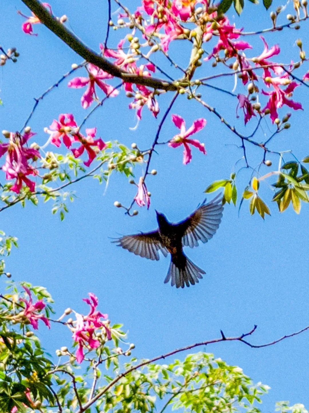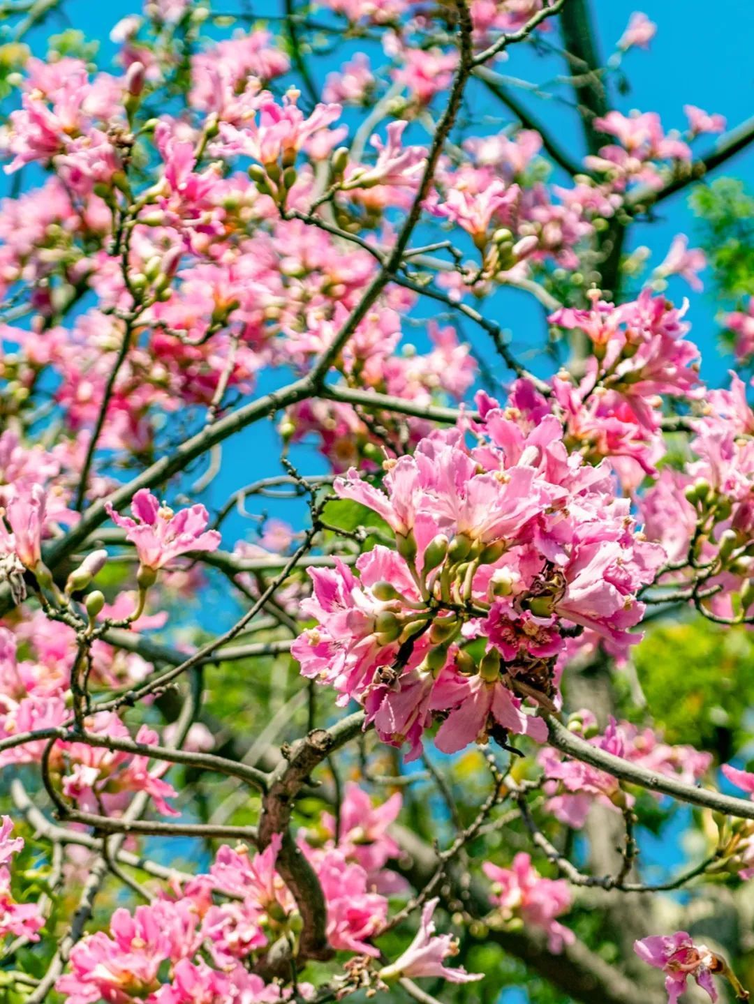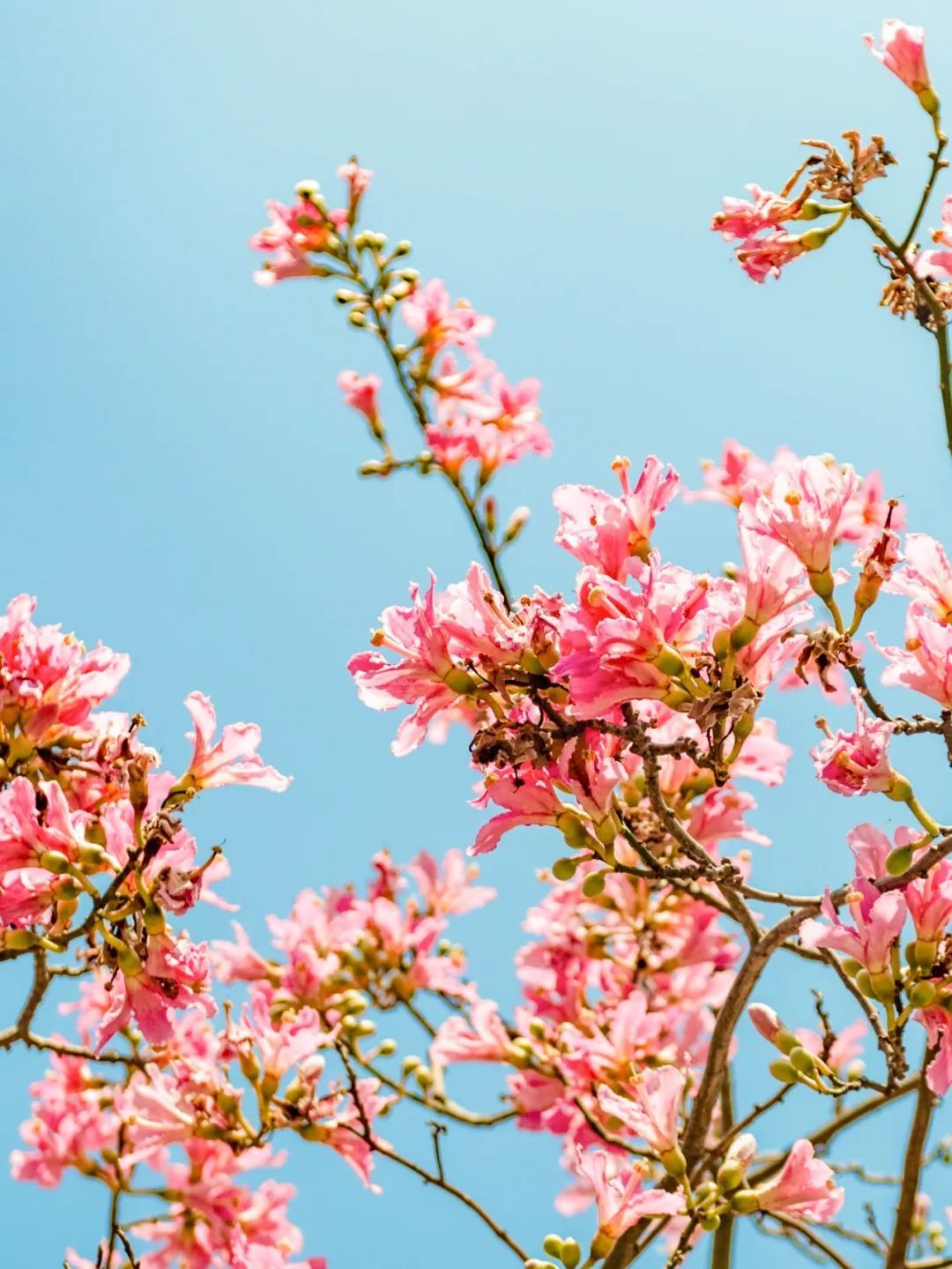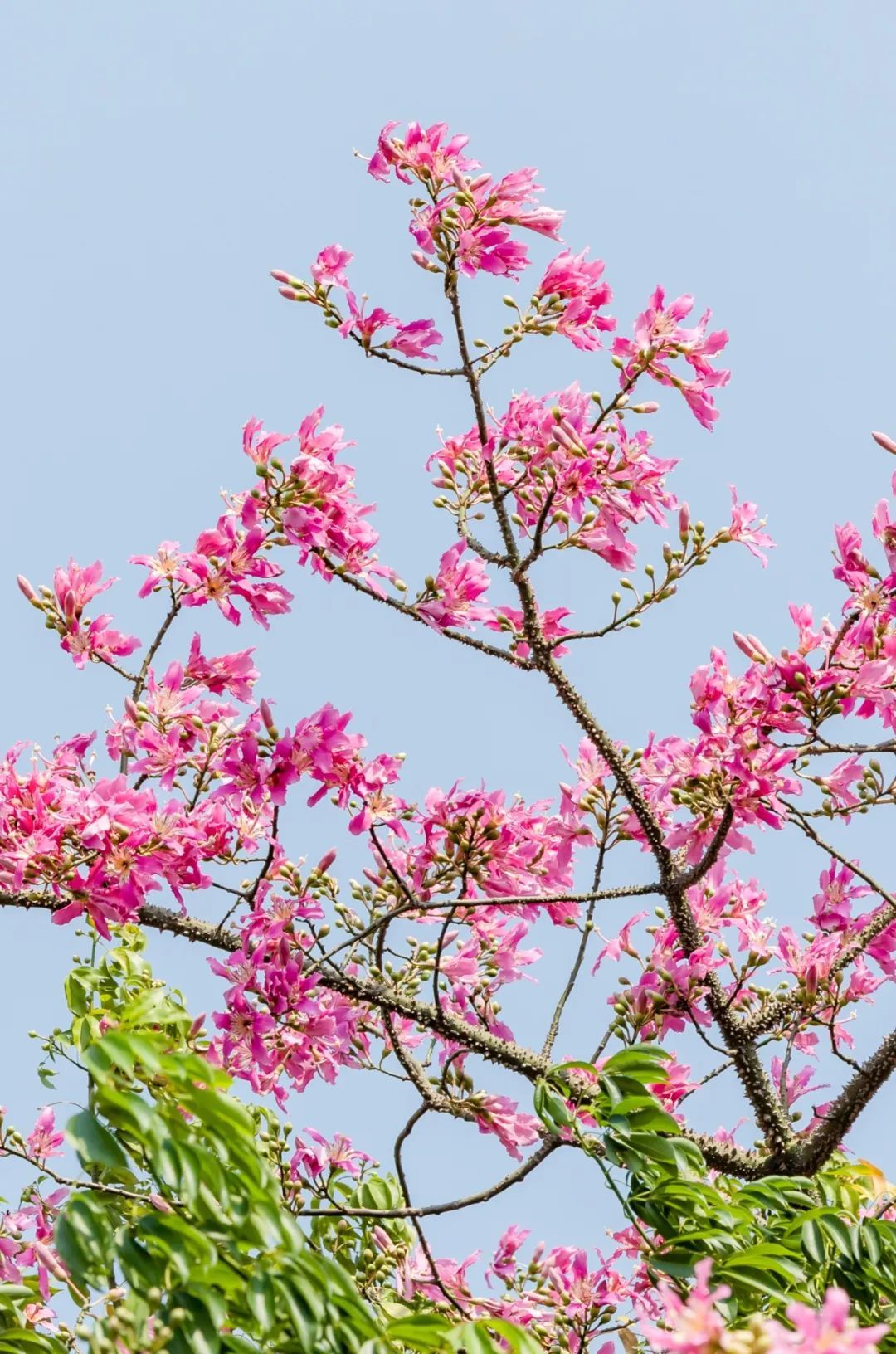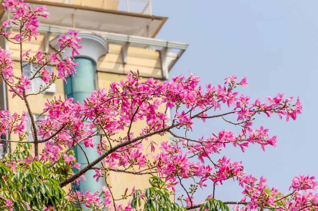 近期晴好天气,在蓝天的映衬下,美丽异木棉树上挂满一簇簇花朵,大且娇艳、灿若烟霞。