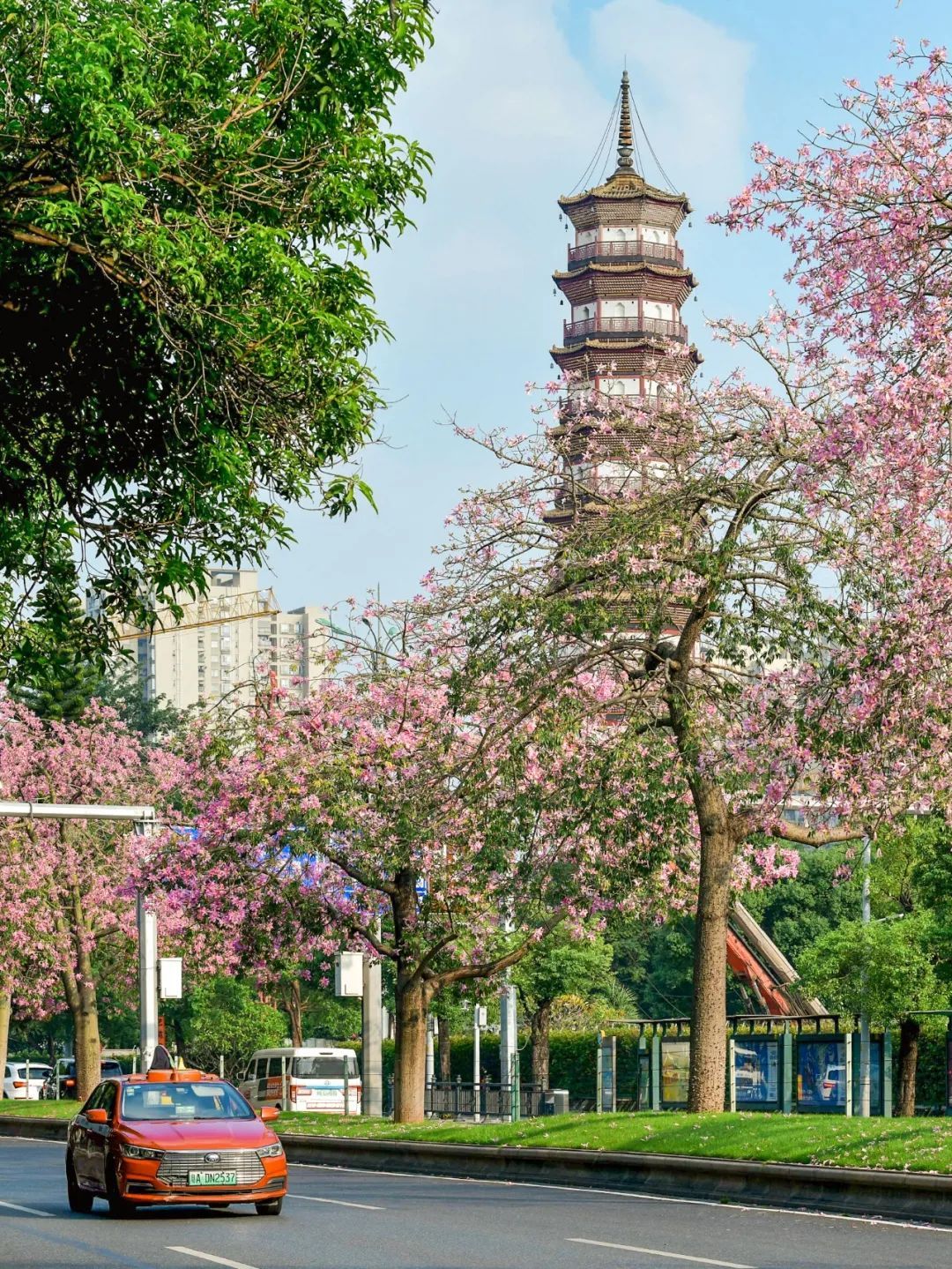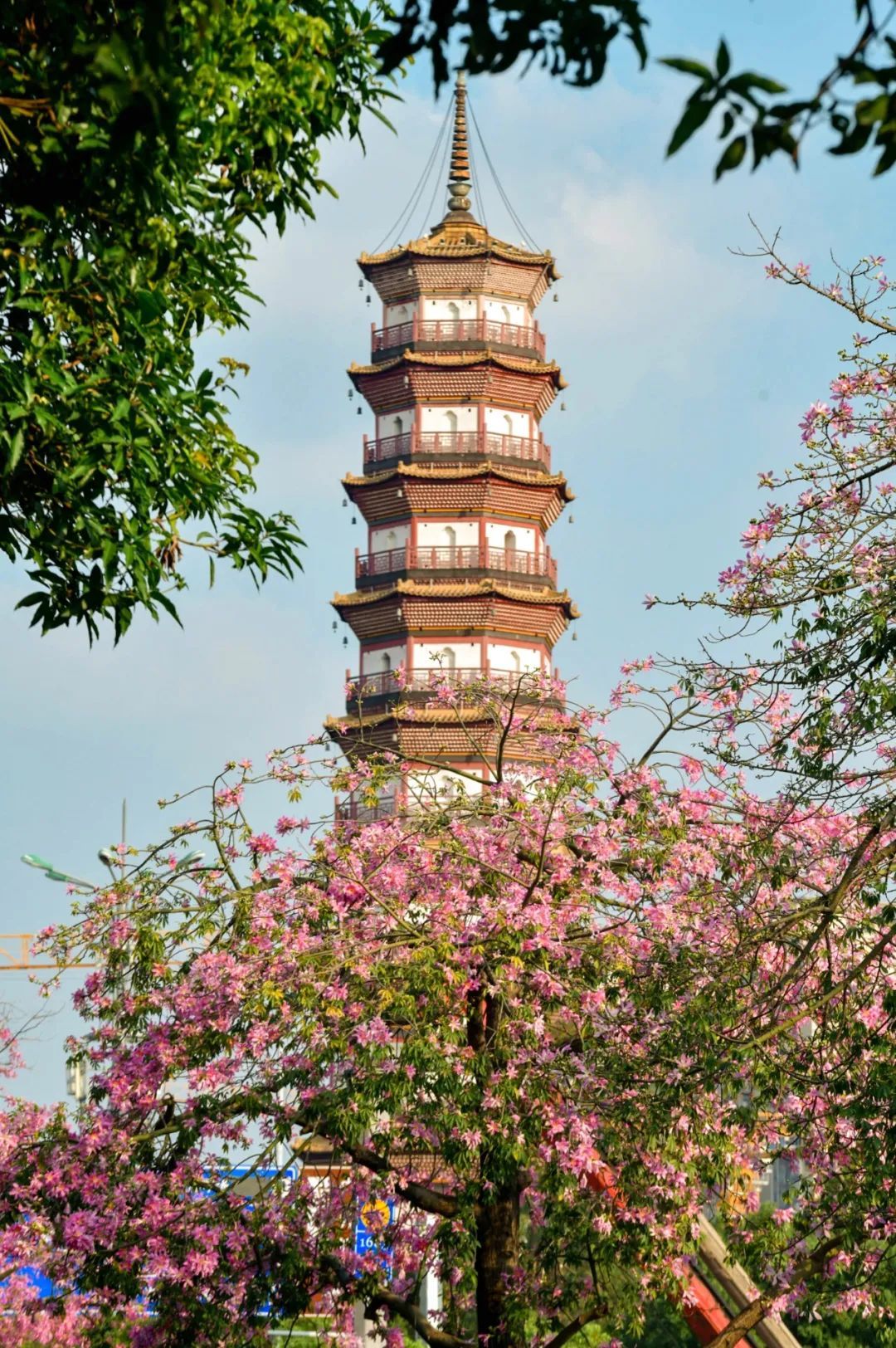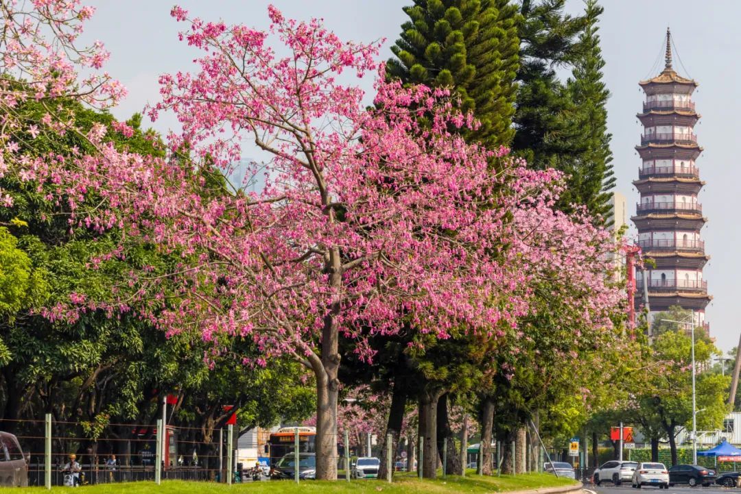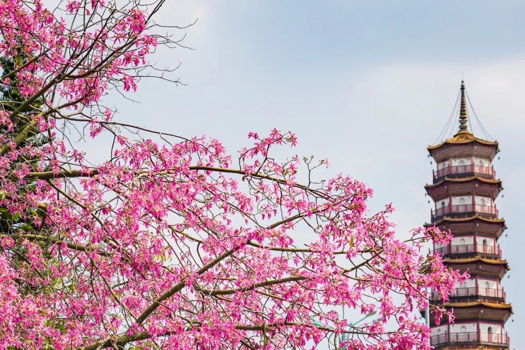 ▲▼ 近期,海珠区艺洲路花基的美丽异木棉花开正艳,满树的粉色花朵与赤岗塔交相辉映,尤为好看。(摄影|杨耀烨)