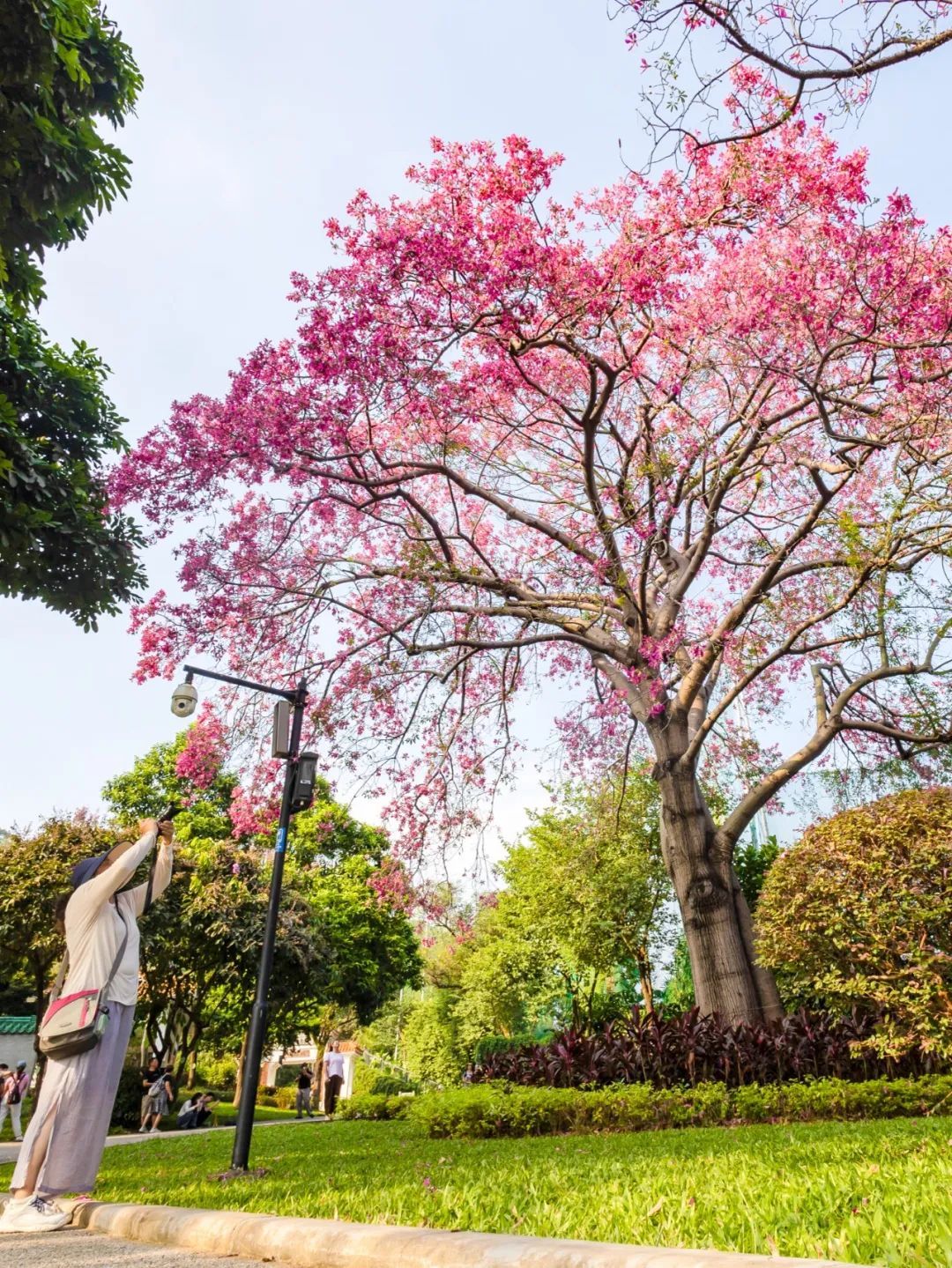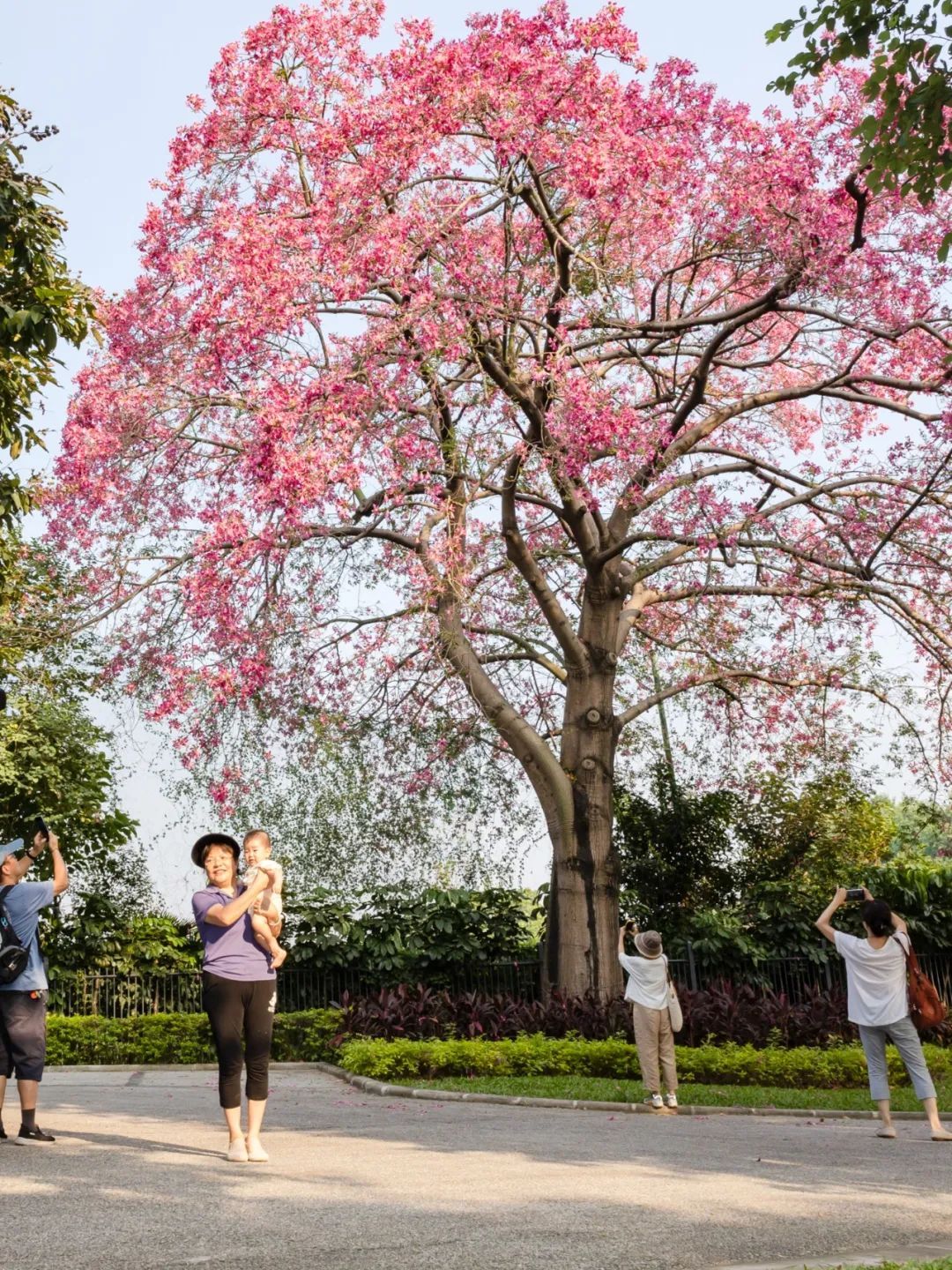 ▲▼10月8日,越秀区麓湖景区,聚芳园内的一株美丽异木棉已进入盛花期,树下站满了前来拍照的市民,满树繁花,惬意休闲。(摄影|陈忧子)