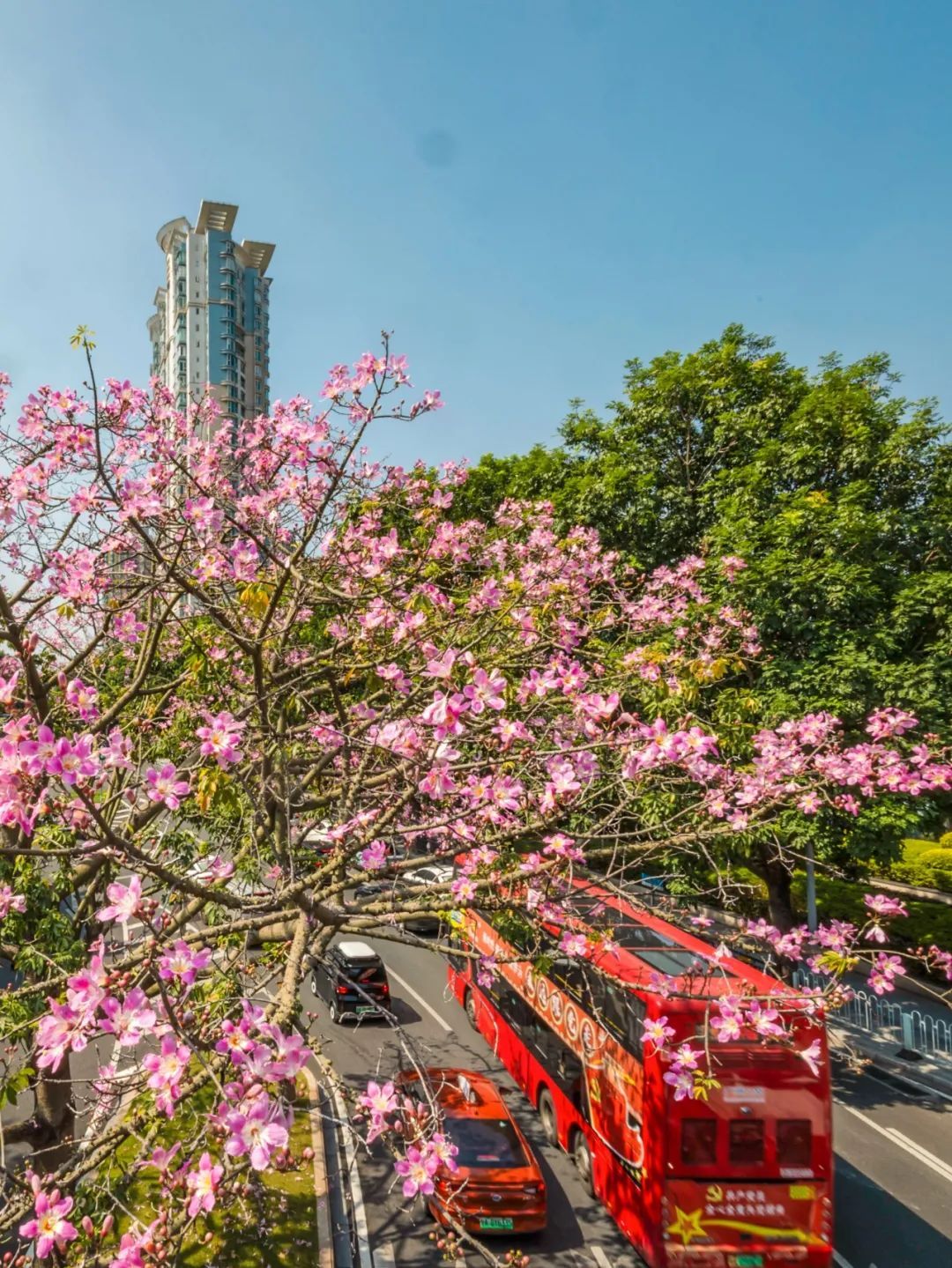 ▲▼10月10日,新滘中路,美丽异木棉在蓝天下绽放,成为街头一景。 (摄影|邱伟荣)