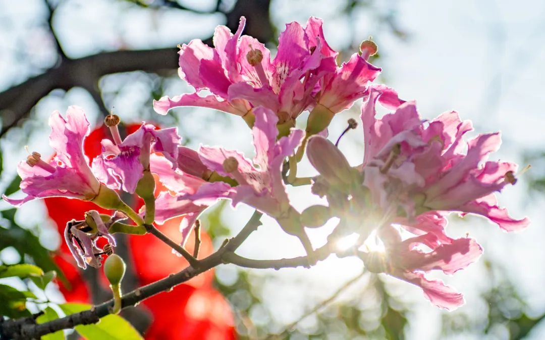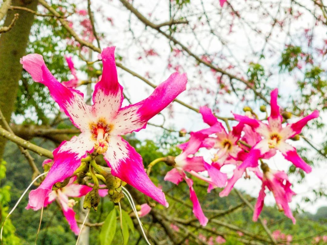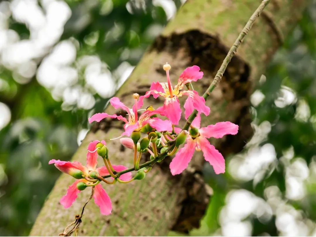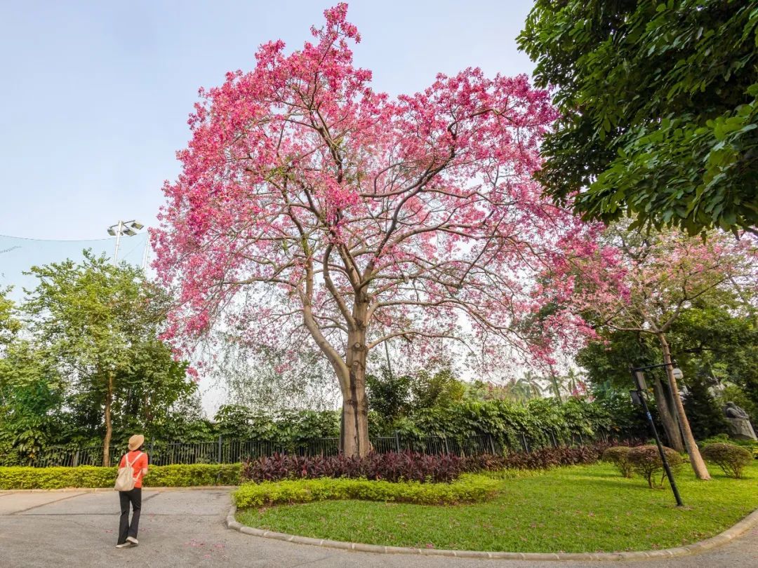 美丽异木棉是优良的观花乔木,又有“美人树”之称,花期一般在秋冬季,而在广州,温暖适宜的气候让它的开花时间有时候会提前,花期也会变得更长。