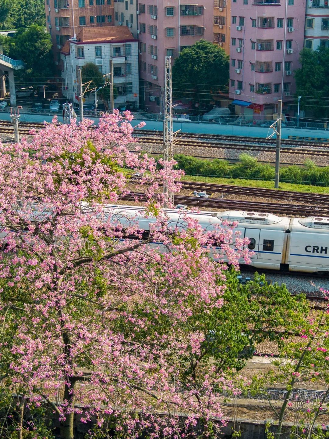 10月9日,广园快速路黄村立交桥下,一排美丽异木棉迎风绽放,远远望去立交桥周边的绿植都被粉红色“花海”所掩盖,不时有列车从花旁驶过。(摄影|杨耀烨)