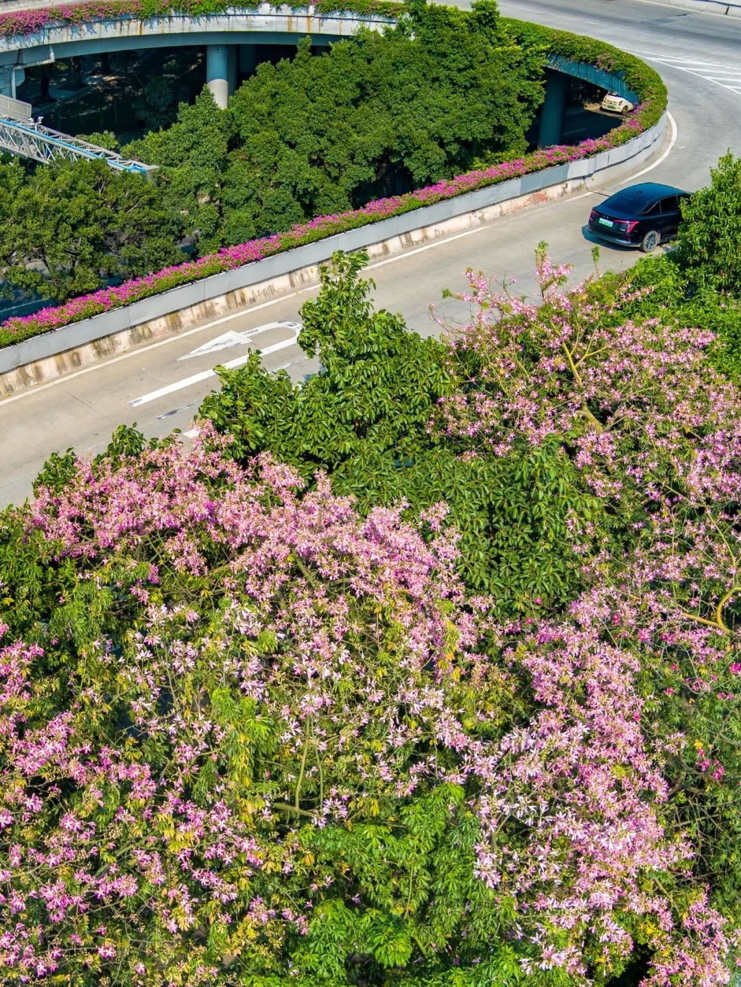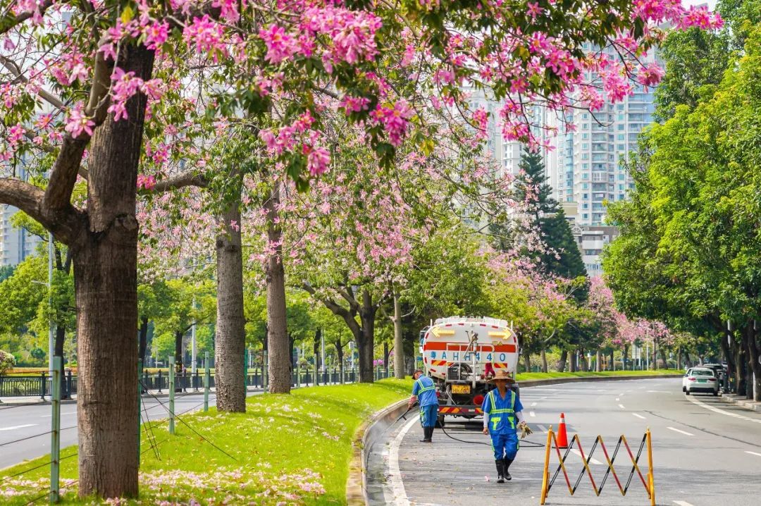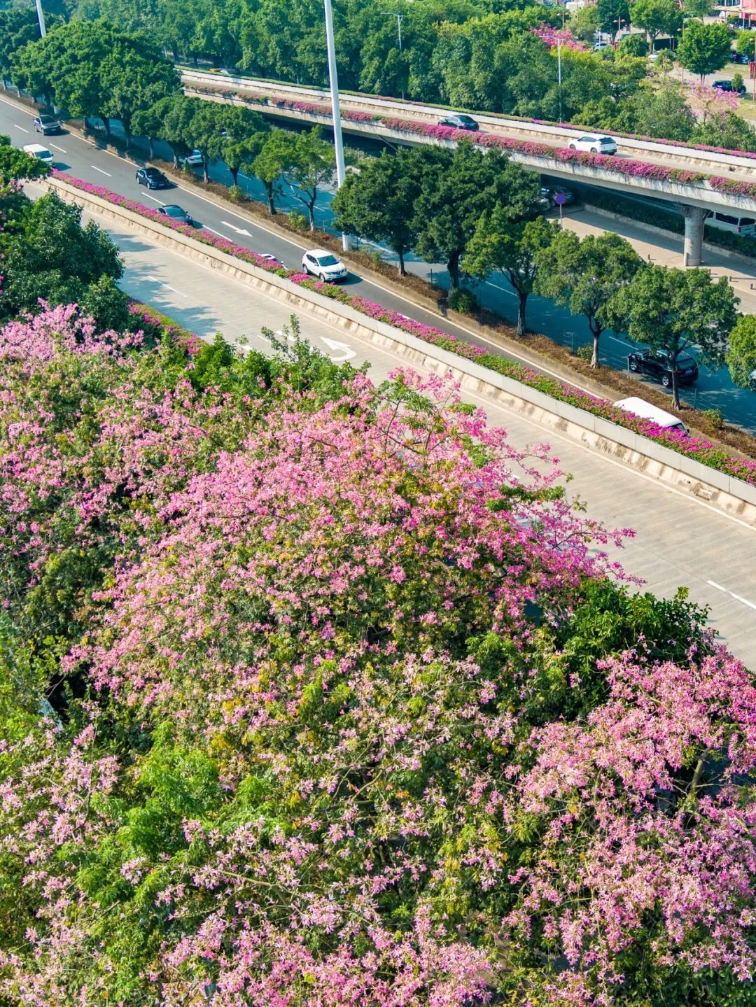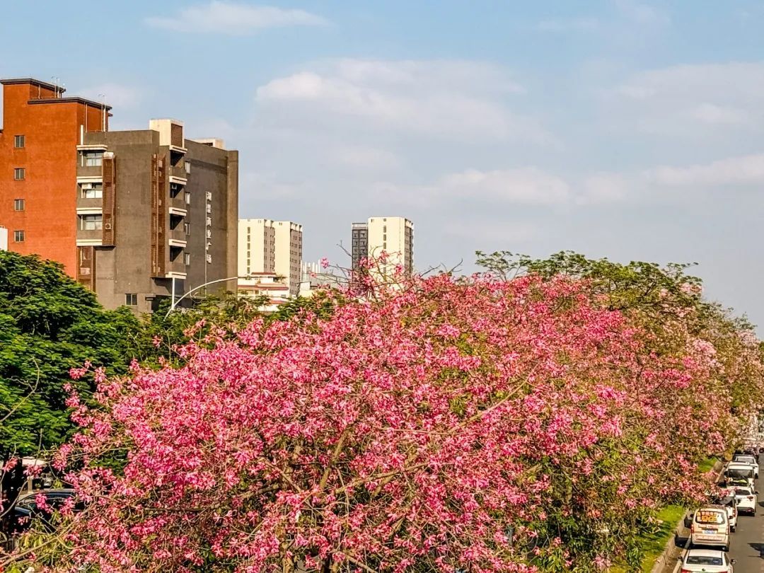 ▲10月11日,艺洲路。美丽异木棉开得层层叠叠,微风拂过,花瓣轻盈飘落,似粉雪飞舞。(摄影|吴子良)