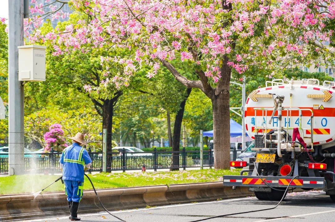 ▲▼10月11日,艺洲路,环卫工人在花树下进行日常的路面清洗工作,顺便清理飘入道路中的落花。工作轮班间隙,环卫工人也偶尔抬头欣赏一下这满树繁花,感受着秋日的岁月静好。(摄影|吴子良)