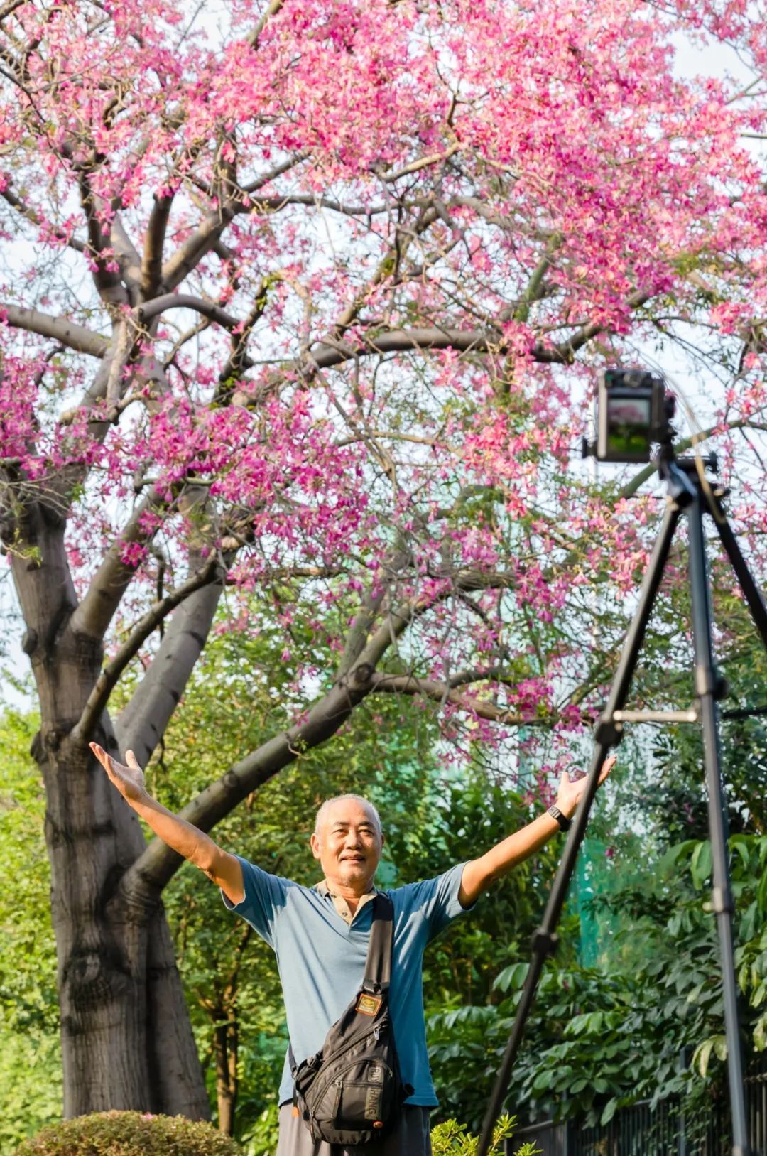 ▲一位长者在树下用三脚架架好相机,定时十秒自拍。(摄影|陈忧子)