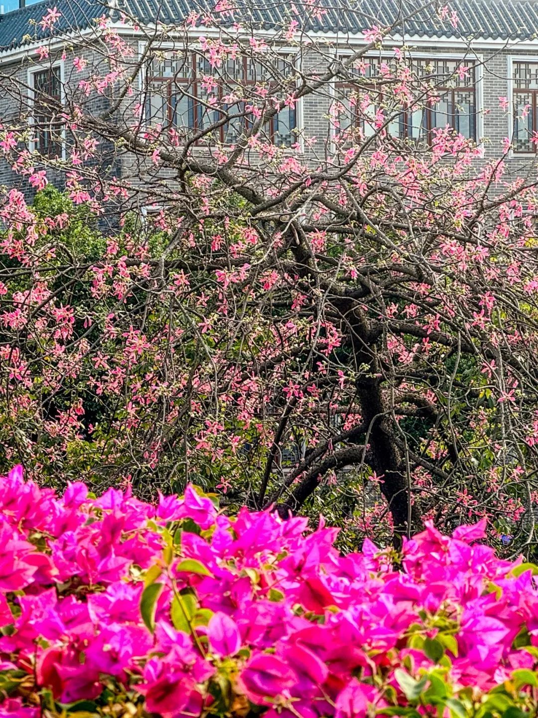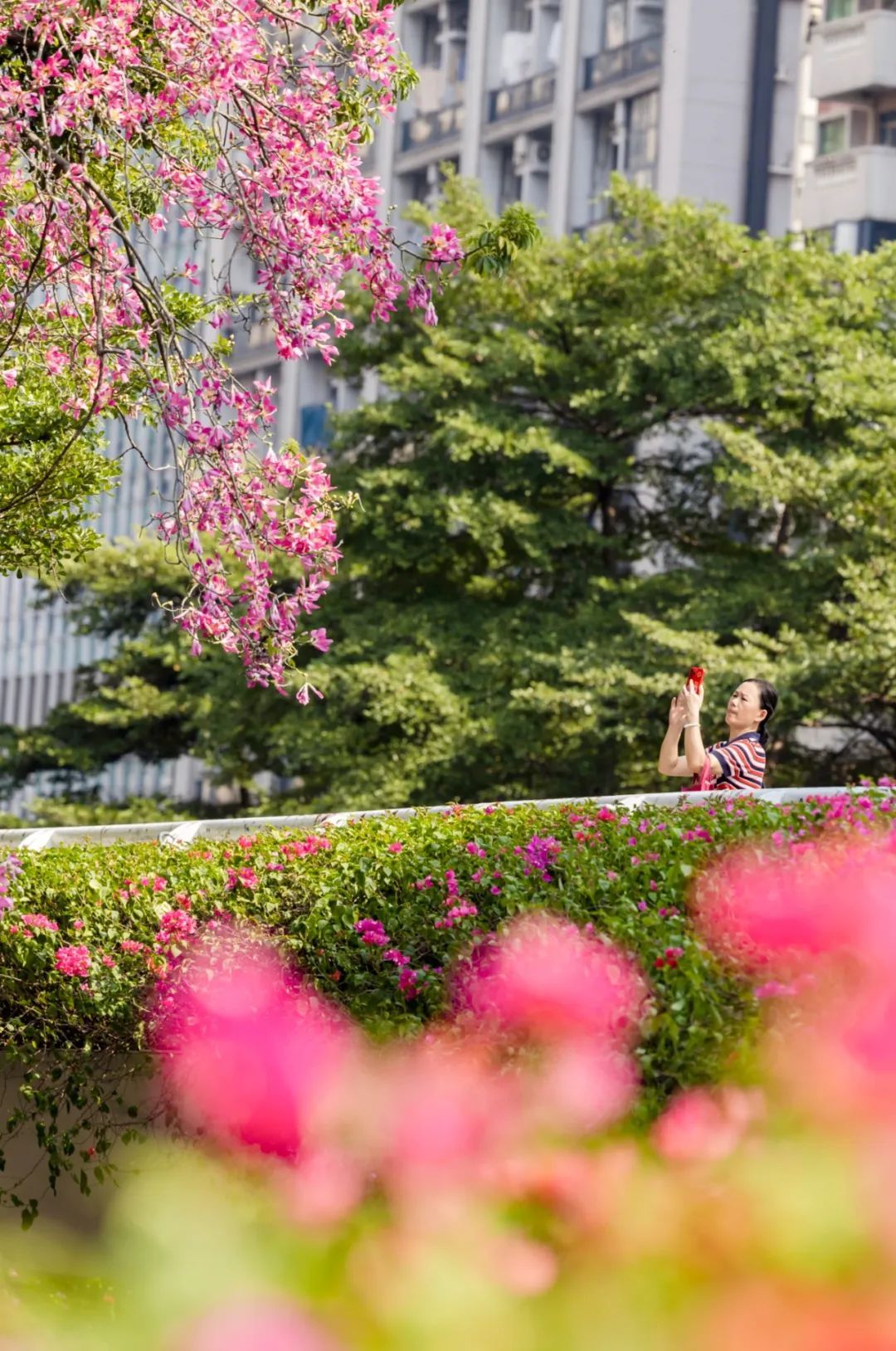 ▲▼广州大道五羊邨地铁站外的人行天桥上,火红的簕杜鹃和美丽异木棉花交相争艳。(摄影|陈忧子)