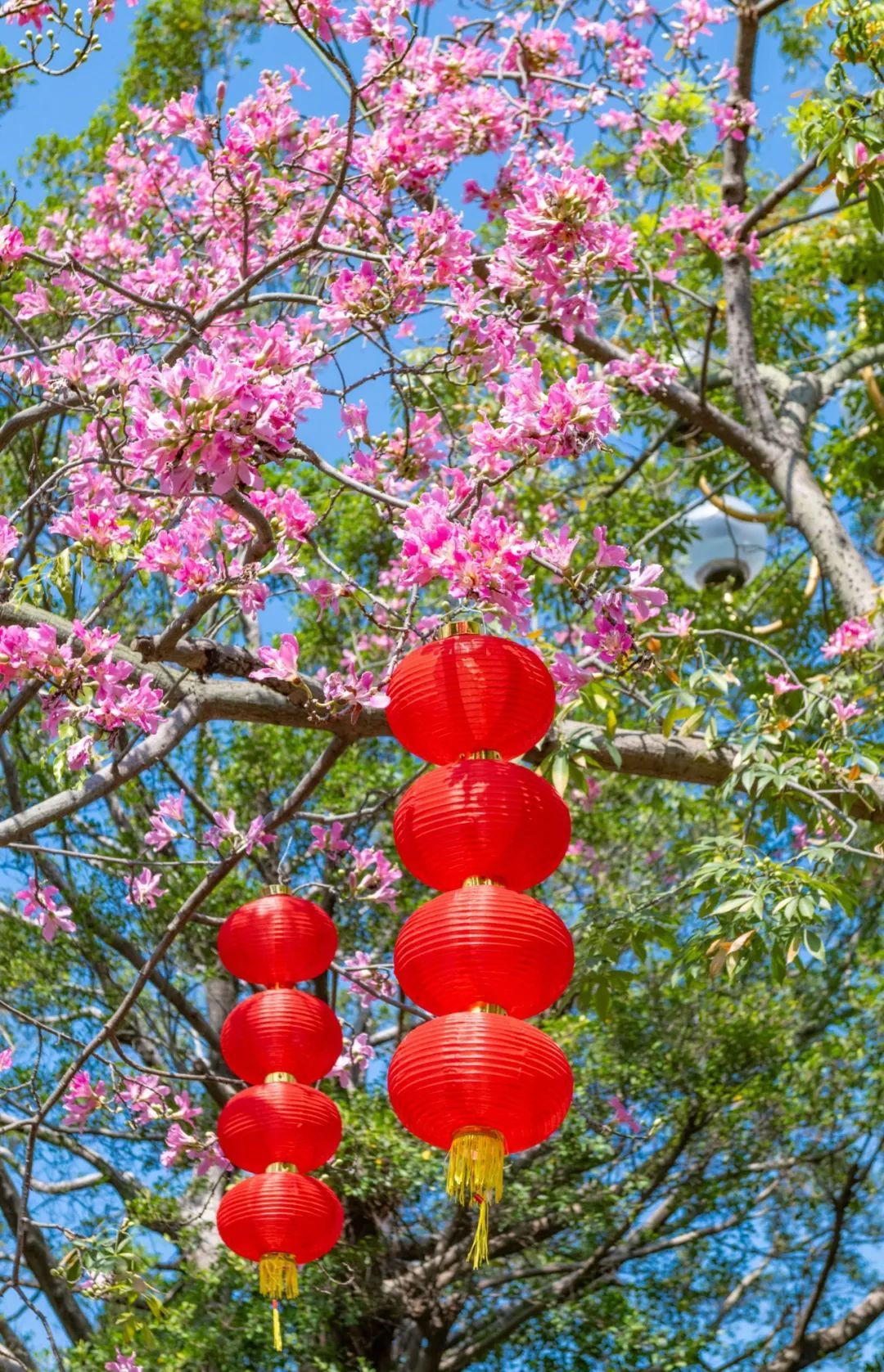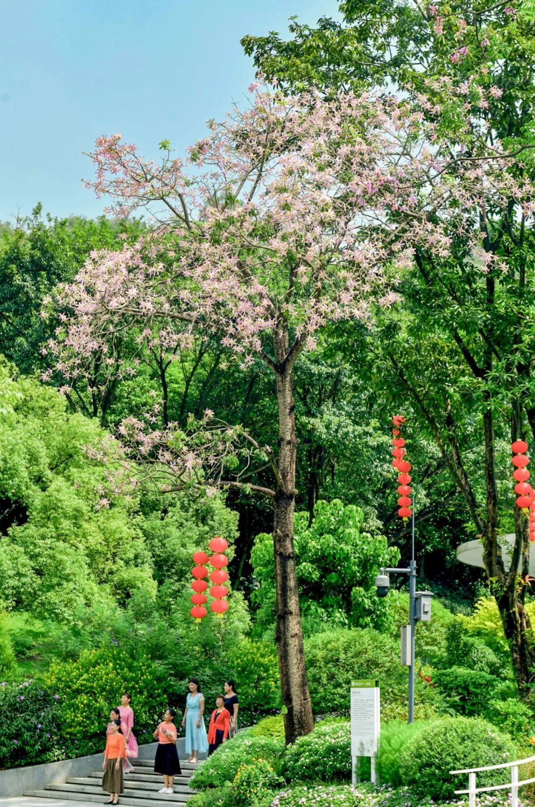 ▲▼ 陈家祠广场的美丽异木棉开了,花朵与红灯笼相映成趣。(摄影|廖雪明)