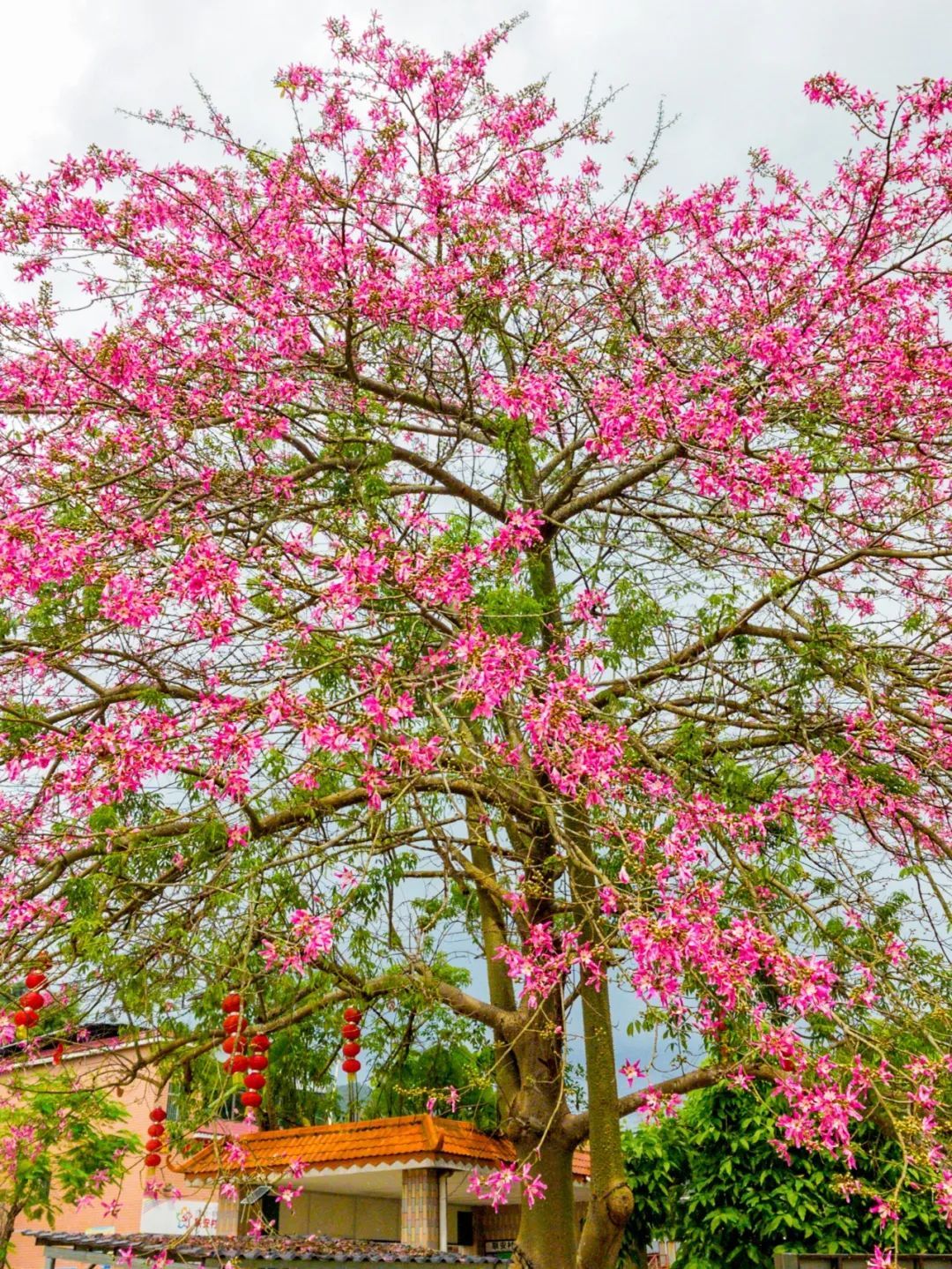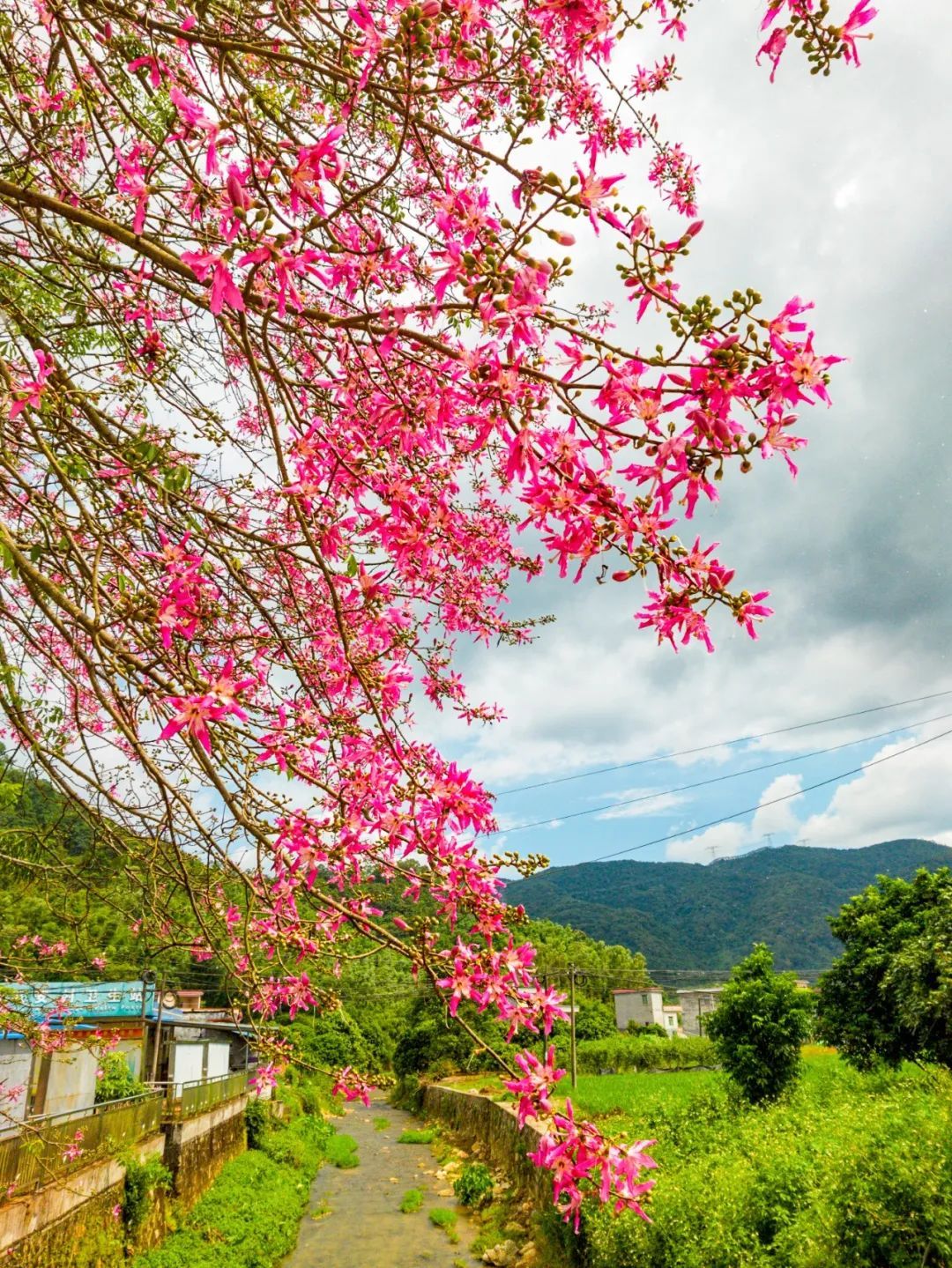 ▲▼9月24日,广州增城区中新镇联安村车站旁,古屋桥桥头有一株枝叶繁茂、花色艳丽的美丽异木棉,整棵树花朵盛放如同一大团红云,艳丽绚烂。(摄影|王维宣)