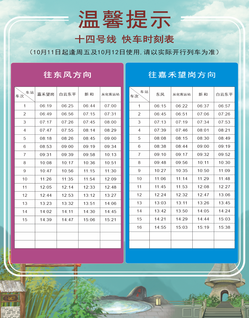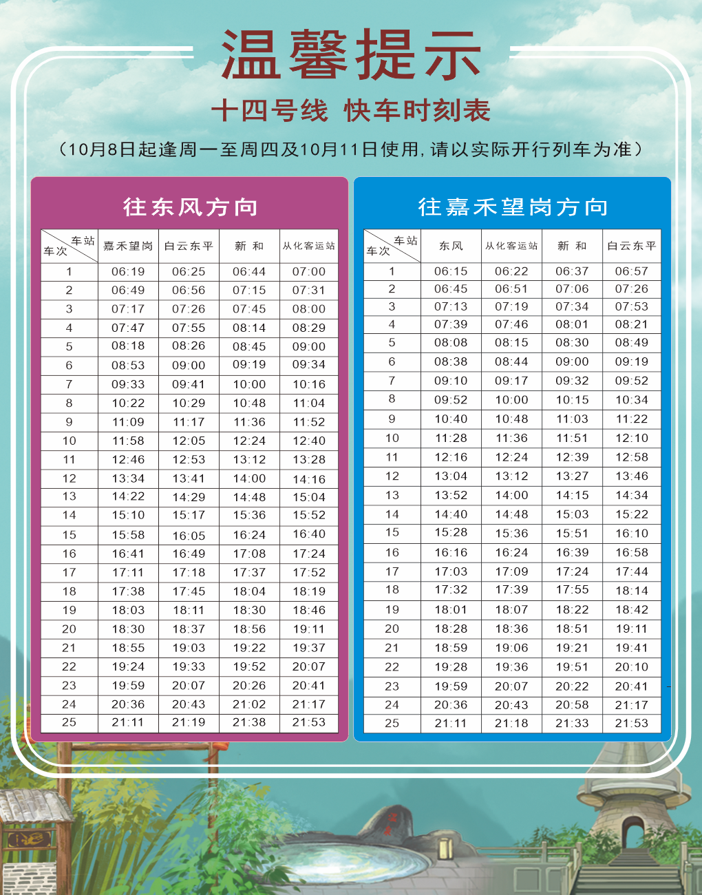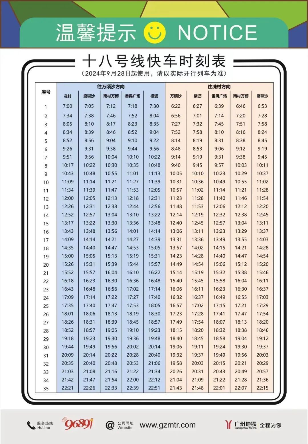 快车的实际到站时间会根据线路运营组织情况有所调整,时刻表仅供大家出行参考,请提前规划路径,搭乘地铁时请留意车站广播及电视上的列车信息,预留足够乘车时间,尽量错峰出行。