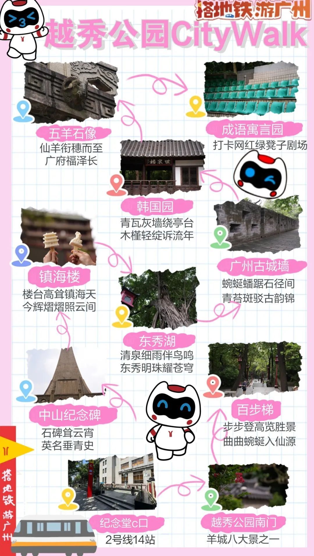 打卡路线:广州地铁2号线中山纪念堂C出口☞越秀公园南门☞百步梯☞中山纪念碑☞镇海楼☞东秀湖☞古城墙☞韩国园☞五羊石像☞成语寓言园(网红绿凳子剧场)