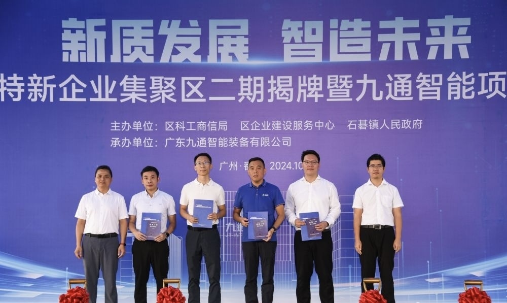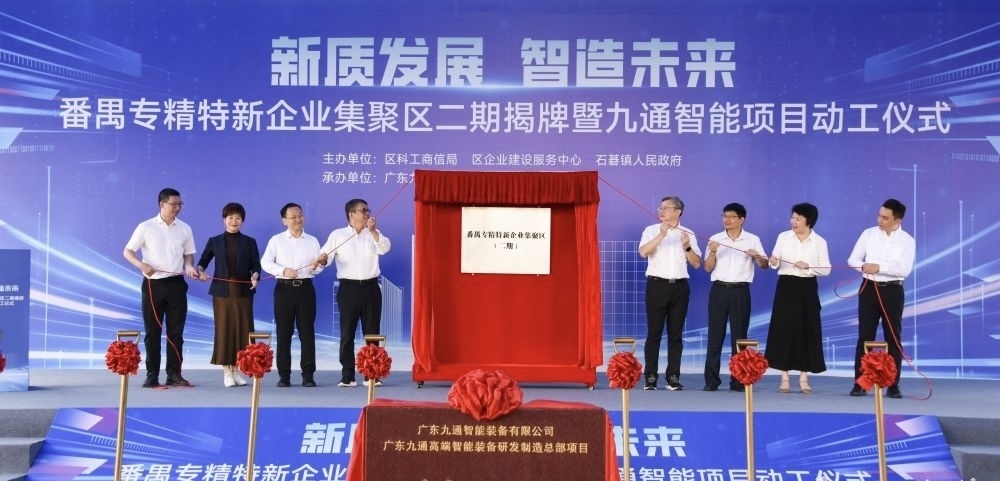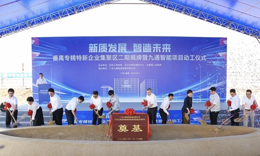 10月11日上午,广州市番禺区举办“新质发展 智造未来”番禺专精特新企业集聚区二期揭牌暨九通智能项目动工仪式,片区内包括九通高端智能装备研发制造总部等4个项目当天获颁建筑工程施工许可证,标志着集聚区二期全面进入动工建设阶段,未来2年将全面建成新型工业化产业园区。