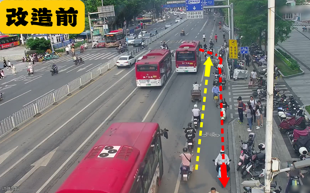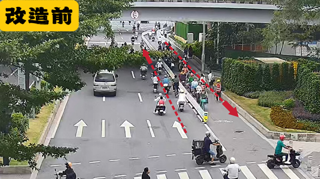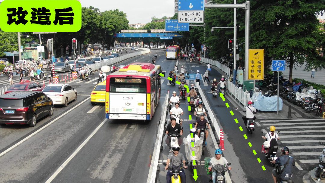 “近期,我们重点围绕交叉口慢行系统的完善和整体通行效率的提升,精细研定优化方案,通过调整路口布局、优化车道分配等方式,逐步完善路口非机动车过街通道,减少机非混行,改善通行秩序。”广州交警介绍,如芳村大道西、广州大道广园东路口、三元里大道广园西路口等点位慢行系统优化后,非机动车通行守法率均达到90%以上。