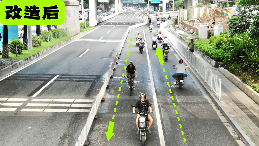 “通过实地调查,结合该路口的交通特性,我们因地制宜创新设计了‘单侧双向通行’非机动车道的改造方案。”广州交警介绍,针对芳村大道西(滘口客运站至双桥路)段东往西出城方向,交警部门结合路段车流量分析及通行安全评估,通过减少一条机动车道,打造“单侧双向通行”非机动车道,从滘口客运站直接衔接珠江大桥慢行通道出入口,有效减少了多个交织冲突安全隐患。
