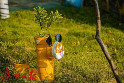 园内利用废弃水管回收制作而成的盆栽造型。