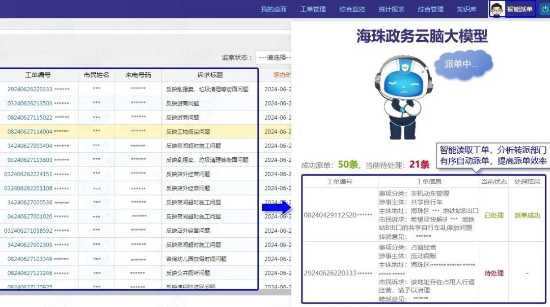 “侨港路口有个商铺用喇叭揽客,噪音扰民,请管理部门尽快解决。”近日,12345市民热线接到一起投诉,海珠政务云脑大模型立刻对投诉工单进行分析,快速获取事发地点,智能研判群众诉求,并自动分派至属地街道处置,仅1天就完成诉求办理,比法定时限10天提前了9天,获得群众“非常满意”评价。