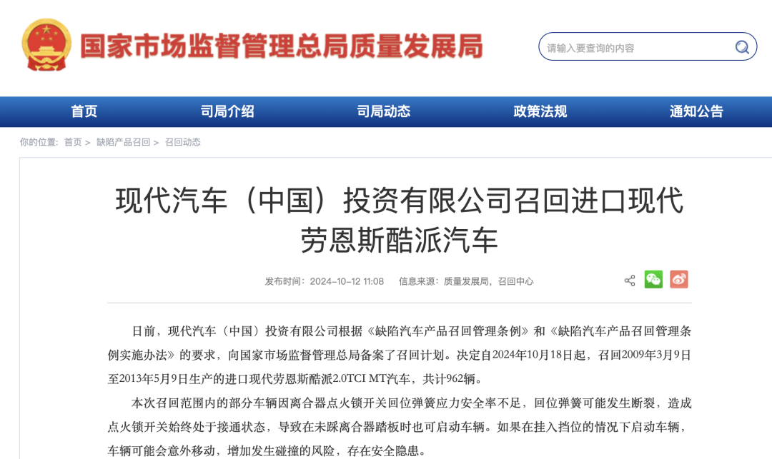 其中现代汽车召回962辆进口现代劳恩斯酷派2.0TCI MT汽车,阿斯顿马丁合计召回98辆旗下多款进口车型。
