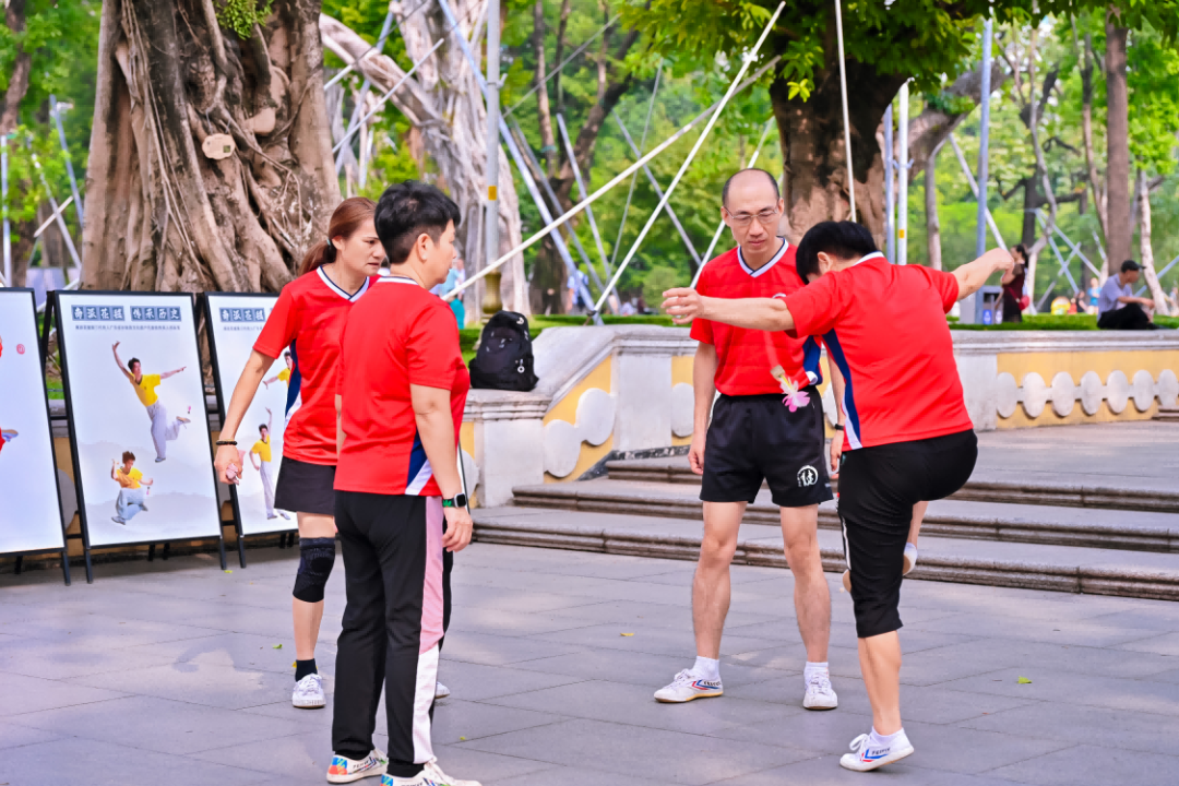 当天,人民公园管理中心发布主题曲《明珠辉映耀花城》,为花城谱写生生不息、历久弥新的新乐章。人民公园活动团队在东区活动广场开展各类文体活动。她们或以轻盈优雅的舞步展现生命的活力,或以轻灵沉稳的太极演绎人生的哲理。
