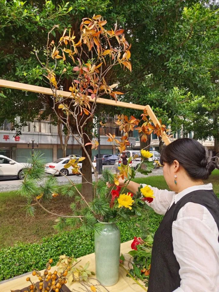 在人民公园历史文化厅北侧活动平台举办的“花漾年华”花艺活动上,市民游客可以欣赏到觉色花艺设计创始人陈玲俐的插花技艺,她还和市民群众一起围绕人民公园103周年主题制作了插花作品,用繁花点亮人民公园百年芳华。