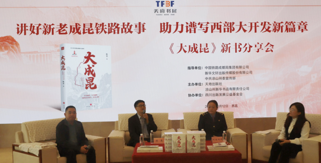 10月12日,中宣部主题出版重点出版物选题、长篇报告文学《大成昆》新书分享会在2024天府书展举行,作家陈果、“最美铁路人”阿西阿呷、青年教师罗海军三位嘉宾在成昆铁路的重要途经地,也是1970年7月成昆铁路通车庆典的举办地——西昌,为现场读者作了独家分享,共同讲述新老成昆铁路的感人故事。