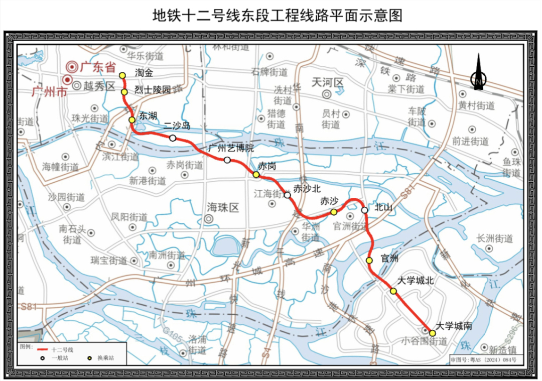 5号线淘金站位于环市路上,本次征求意见的12号线车站位于建设六马路与东风路交界以北,二者以一条超过350米的长通道相连实现换乘。另外,在建的13号线在靠近建设六马路路口的东风路设站,与12号线通道换乘。