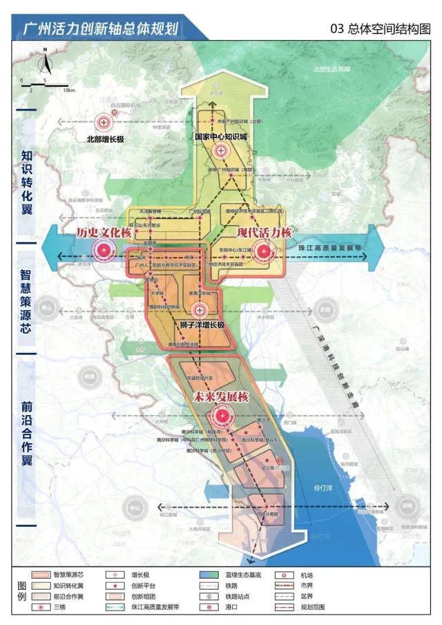 其中,“一轴”即为活力创新轴。为落实总体规划赋予广州全新功能定位,广州市规划和自然资源局同步编制完成《广州活力创新轴总体规划》(以下简称《规划》),在广州已形成的传统中轴线、新城市中轴线的基础上,面向科技时代、湾区时代新谋划了一条重要的城市功能轴线:北起中新广州知识城、南至南沙科学城,串联东部中心、狮子洋增长极等重要战略节点,贯通广州南北、缝合湾区东西的关键区域,面积约1567平方千米。