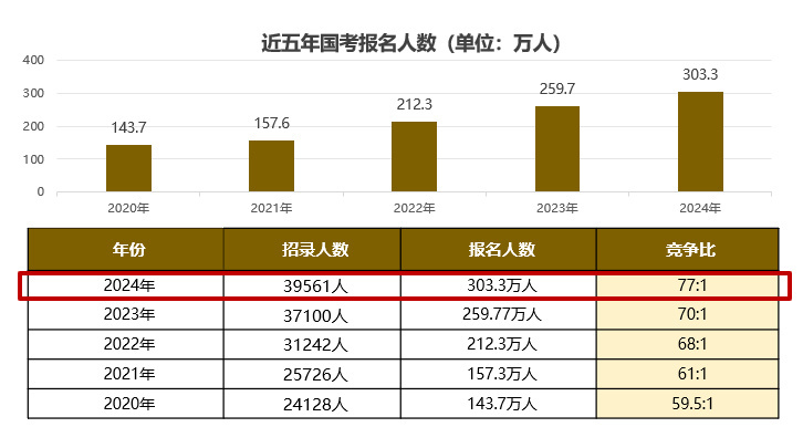 华图教育轮值CEO、华图全国面试学科带头人李曼卿表示,国考竞争越发激烈。近5年间国考报考人数一直处于快速增长中。2024年的报考人数为303.3万人,相较于2020年的报考人数增长了110%以上。虽然国考近几年的招录人数有大幅度提升,但是竞争比始终居高不下,2024年的竞争比达到77:1。