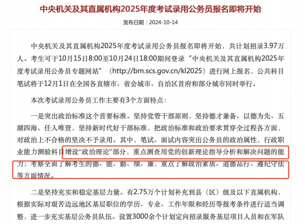 2024年10月14日,中央机关及其直属机构2025年度考试录用公务员(通称“国考”)公告发布,报名时间为10月15日8:00至10月24日18:00。根据公告,2025年度国考招录3.97万人,招录人数再次打破纪录,连续5年扩招。
