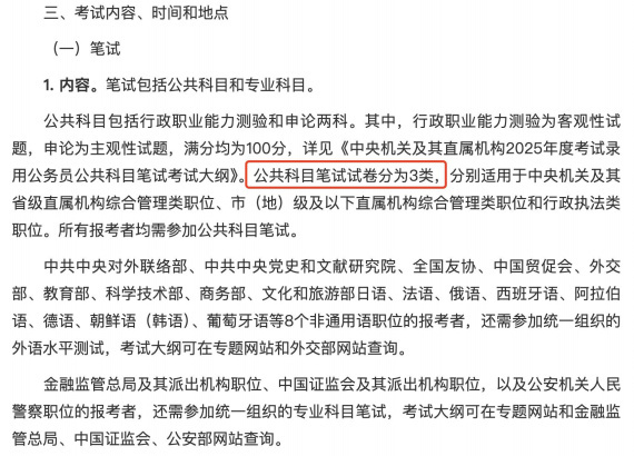 在试卷的分类分级上,2025年国考依旧精准科学推进。2025年国考试卷依然分为三类:中央机关及其省级直属机构综合管理类、市(地)级及以下直属机构综合管理类和行政执法类。对中央机关及其省级直属机构综合管理类职位突出测评理论思维、综合分析等方面能力,对市(地)级及以下直属机构综合管理类职位突出测评贯彻执行、基层工作等方面能力,对行政执法类职位突出测评依法办事、公共服务等方面能力。