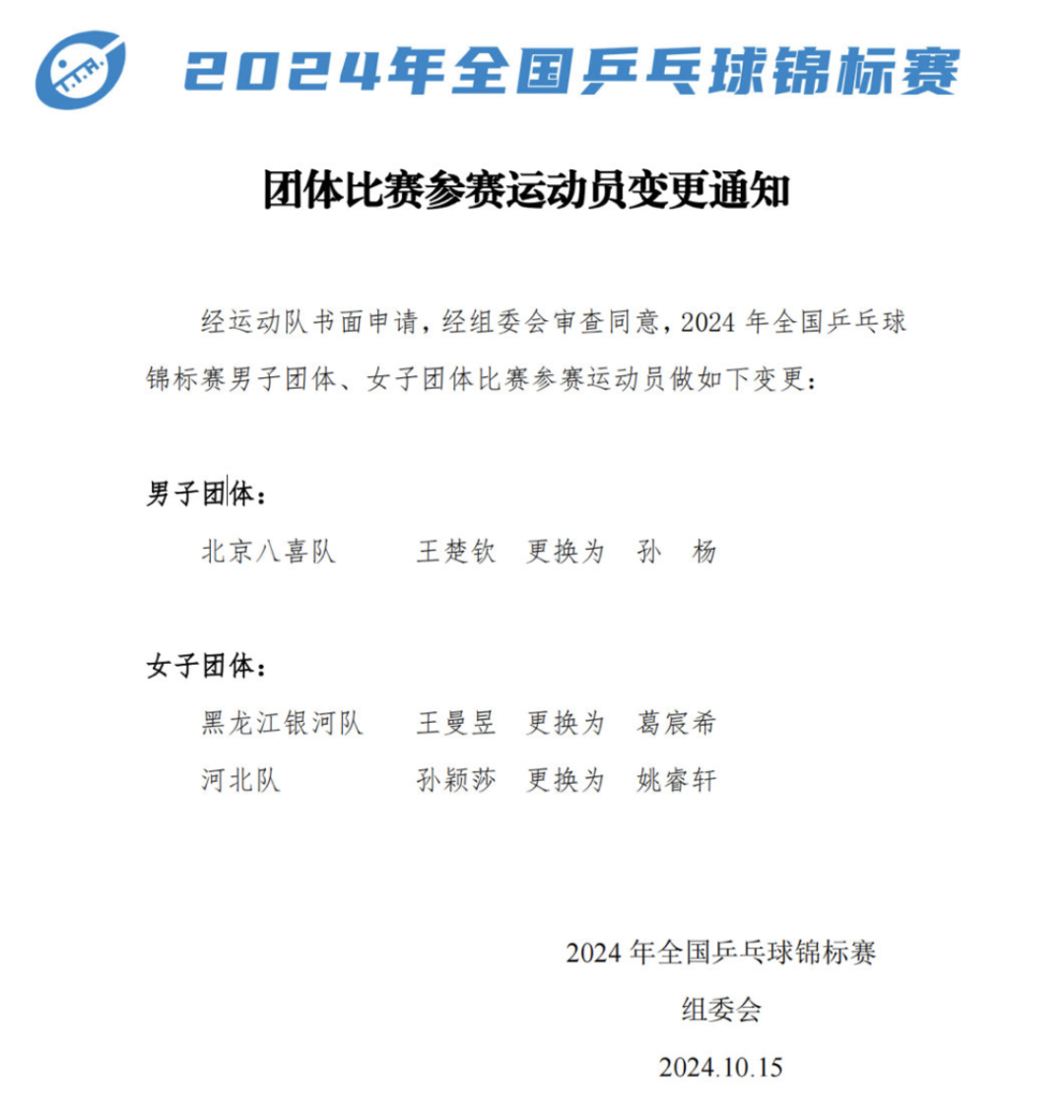 2024年全国乒乓球锦标赛男团和女团项目将于10月16日打响,赛事组委会10月15日下午发出《团体比赛参赛运动员变更通知》,北京队的王楚钦、河北队的孙颖莎、黑龙江队的王曼昱退出团体赛,他们的空缺将由所在队伍其他运动员递补。
