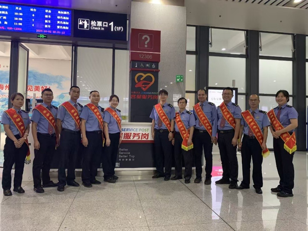 为保障旅客顺利出行,梅龙高铁沿线车站通过增设安检通道、接力服务等多项便民服务,为旅客提供全流程、无障碍的出行体验。“客都服务岗”成员们在进站口、检票口、通道等关键岗位,为老、幼、病、残、孕等重点旅客提供贴心服务。