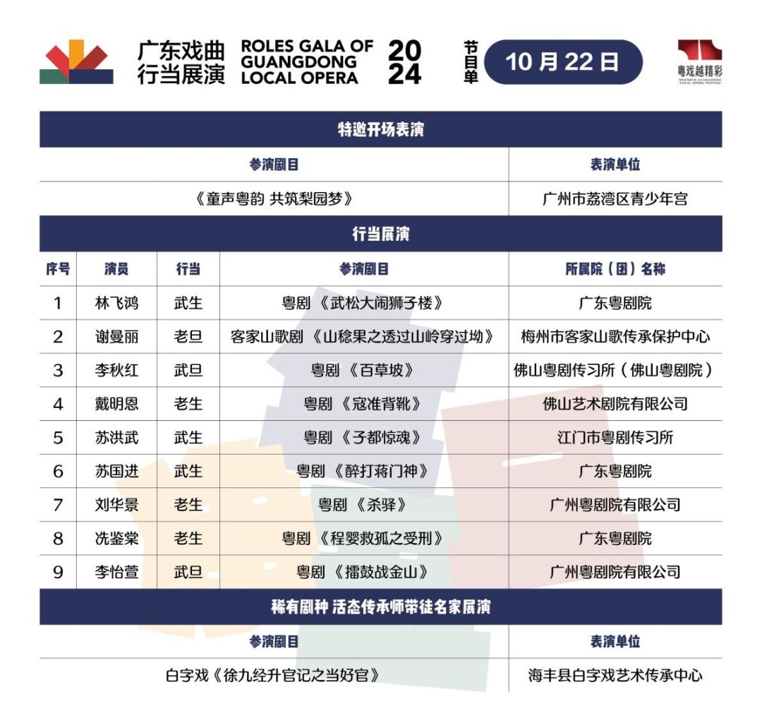 广东省戏曲艺术品牌活动“2024粤戏越精彩·广东戏曲行当展演”将于10月22日—25日在广东艺术剧院举行。